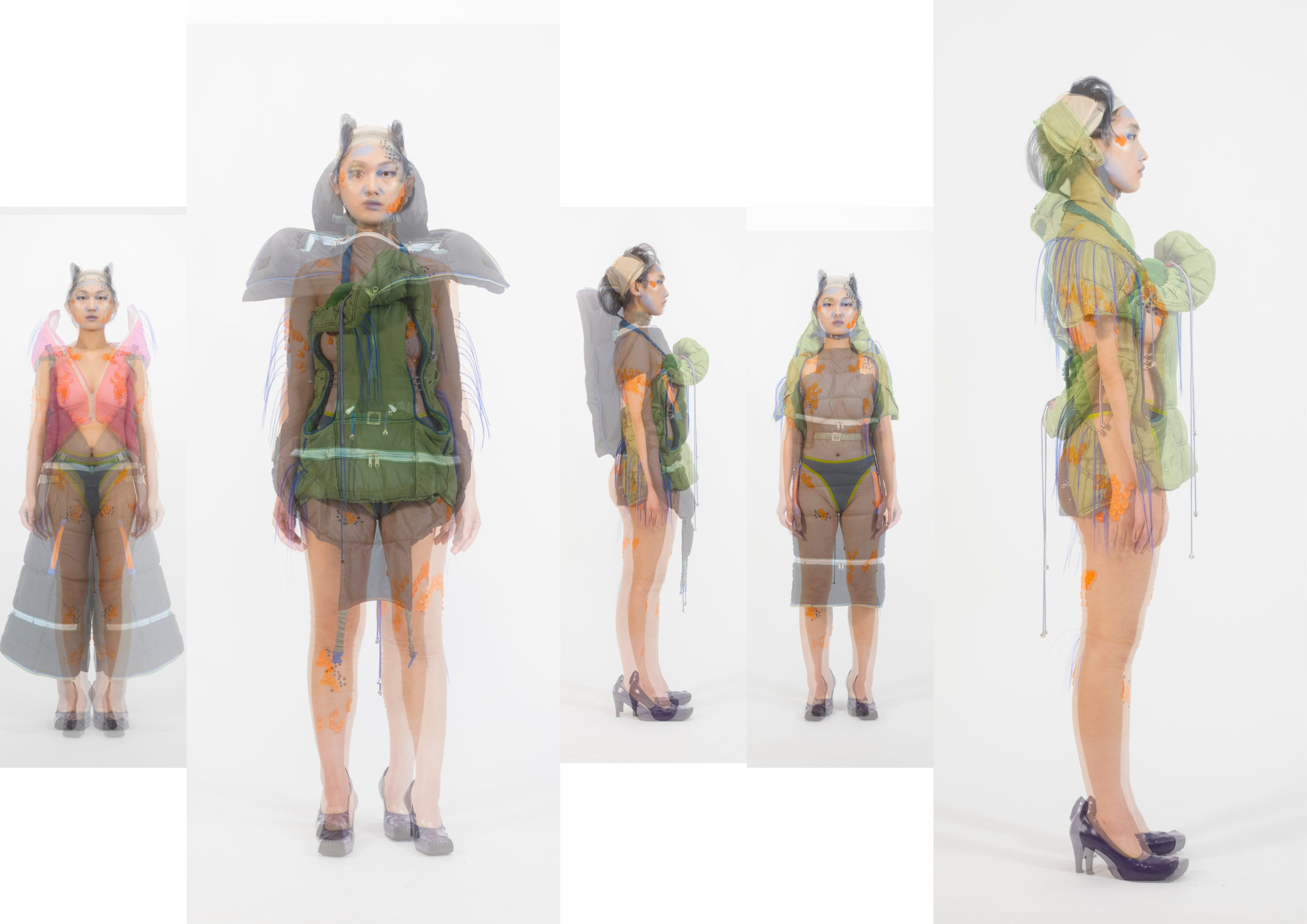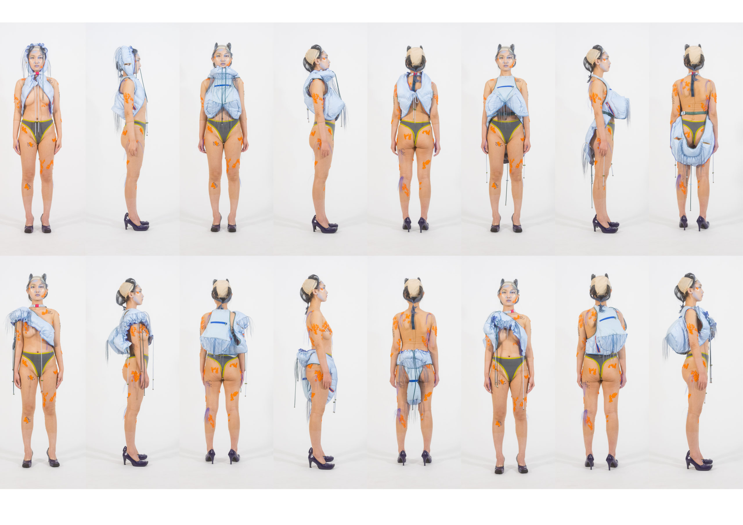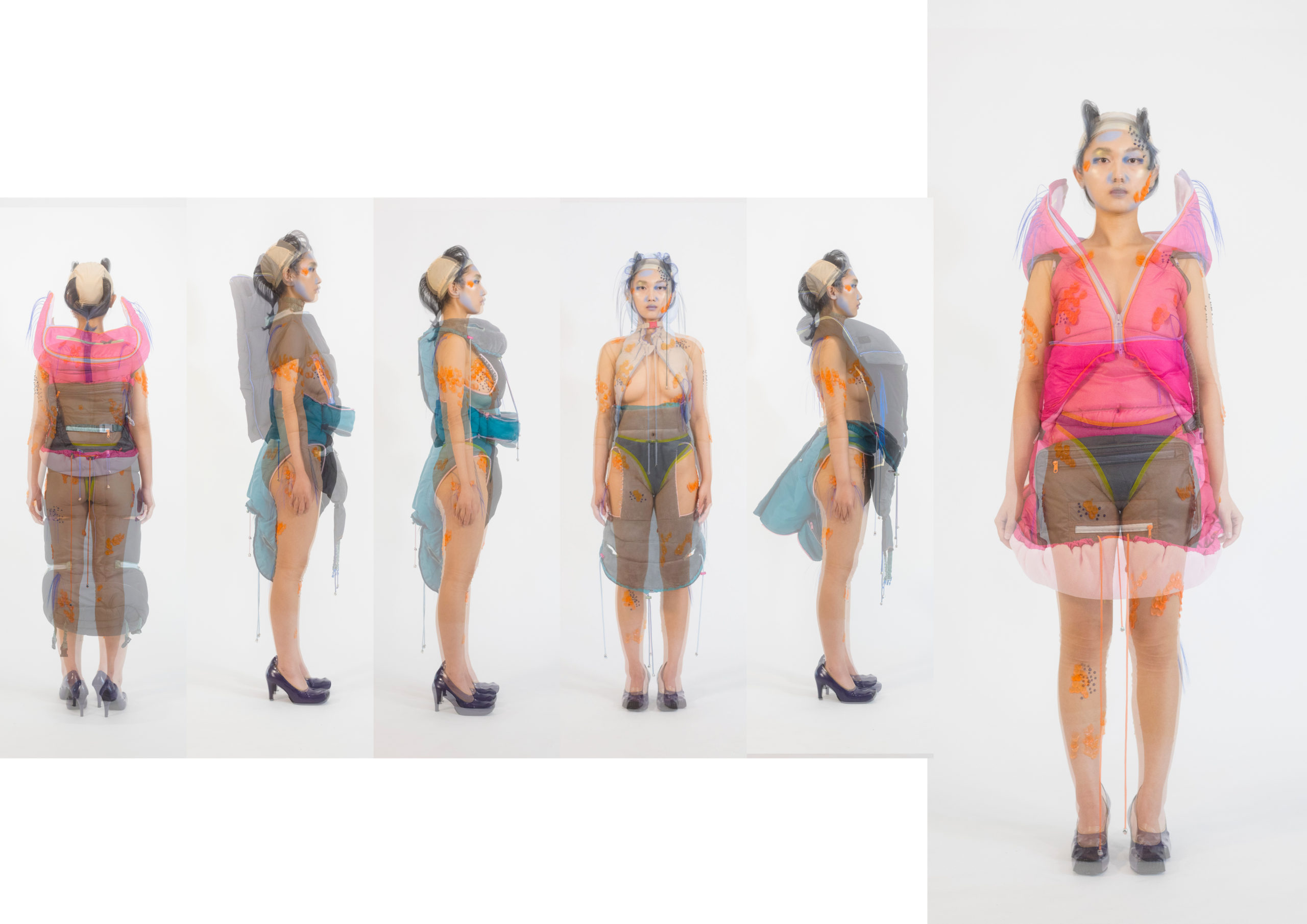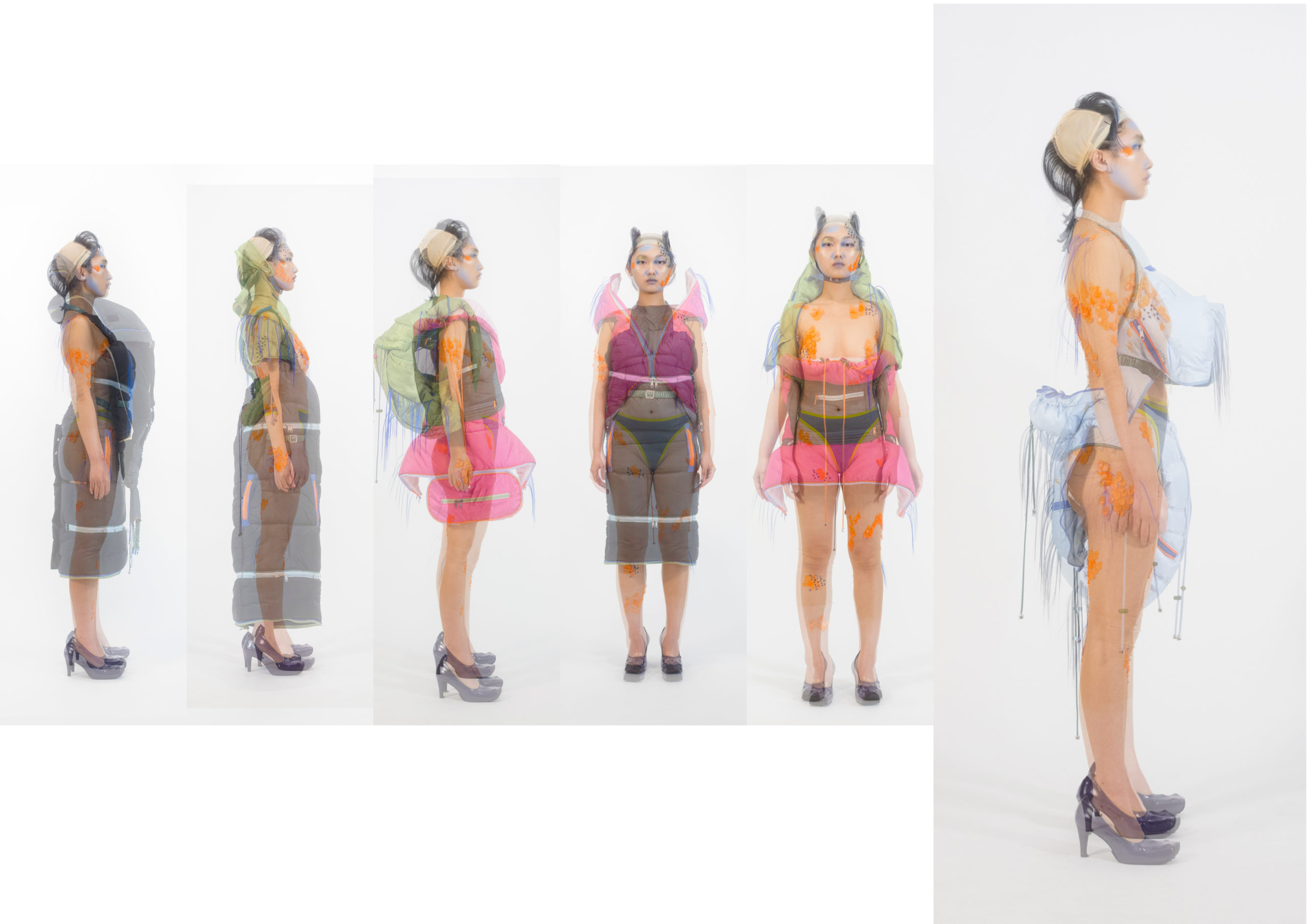 Playing with covering and veiling the body in a society where one is sexualised and sexually objectified, often depending on what and how much one shows off oneself.How do I deal with sexualization? How do I choose to act in this context every day? I seek balance anew every day.The hoodie is the starting point of the veiling. Large opaque volumes drape over the body, making the actual shape of the body unrecognizable. In contrast, tight mesh garments enclose the body tightly and not only leave it visible, but put an additional focus on it.The two materials play with each other, wrestle with each other. They take on the qualities of the other. A negotiation between veiling and unveiling.