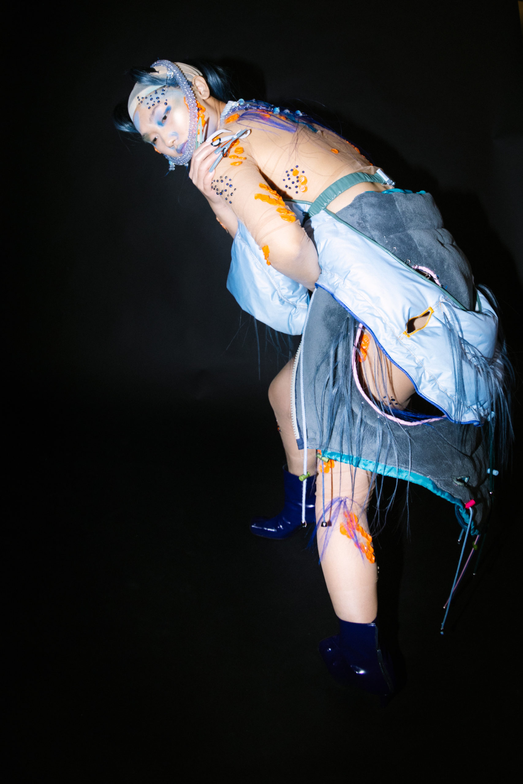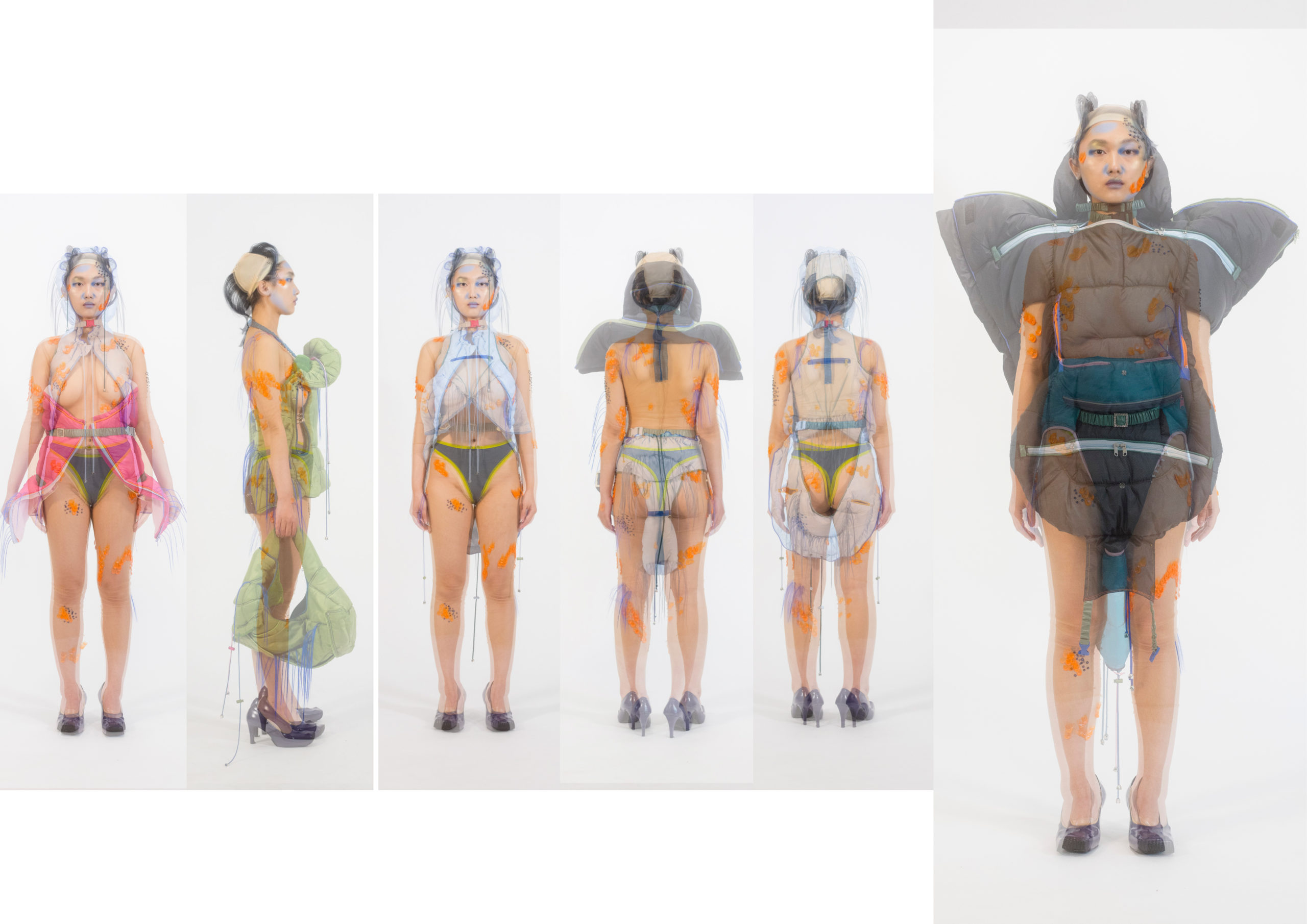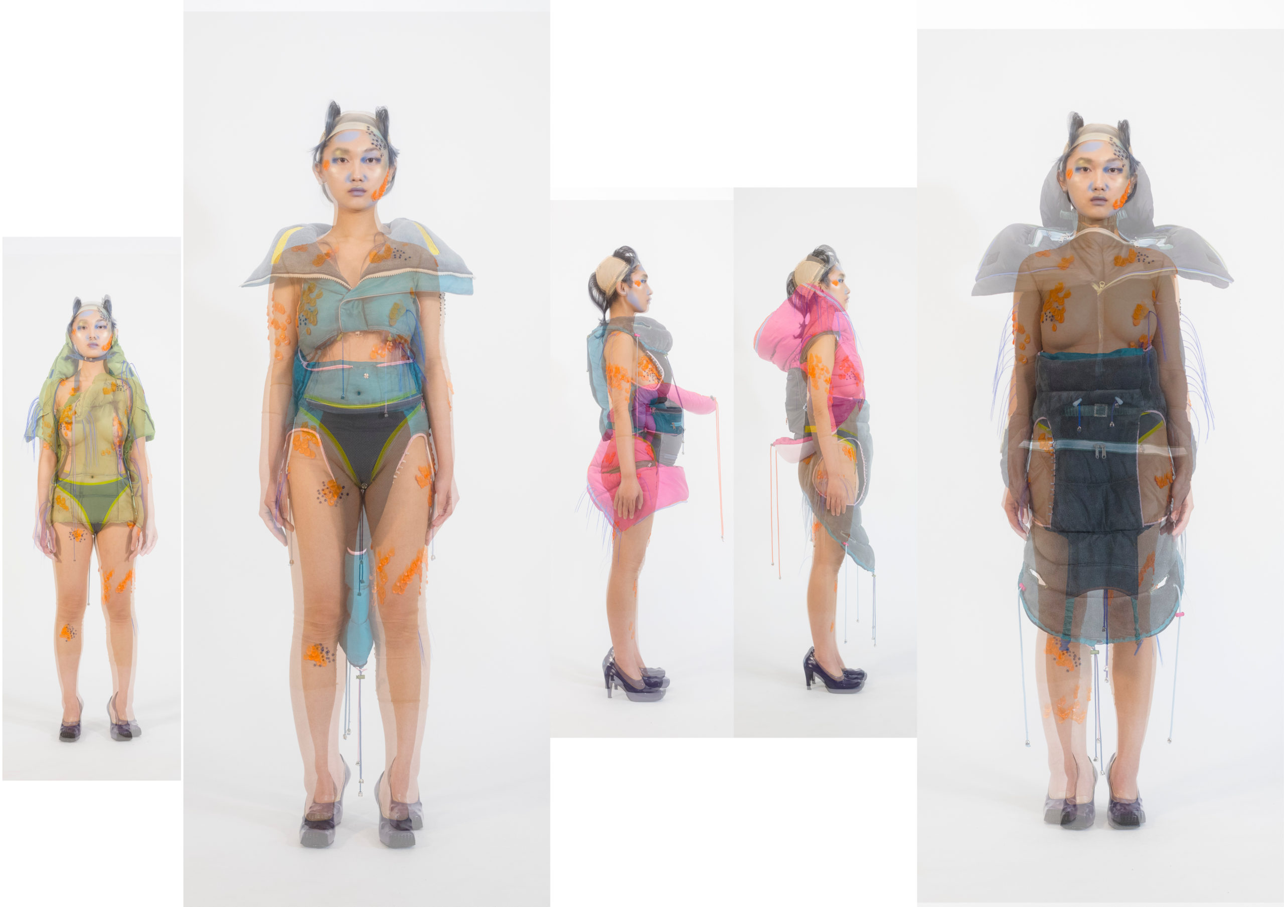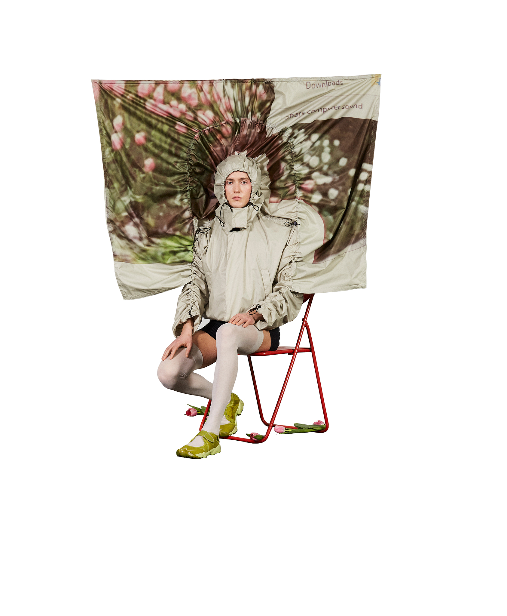 Playing with covering and veiling the body in a society where one is sexualised and sexually objectified, often depending on what and how much one shows off oneself.How do I deal with sexualization? How do I choose to act in this context every day? I seek balance anew every day.The hoodie is the starting point of the veiling. Large opaque volumes drape over the body, making the actual shape of the body unrecognizable. In contrast, tight mesh garments enclose the body tightly and not only leave it visible, but put an additional focus on it.The two materials play with each other, wrestle with each other. They take on the qualities of the other. A negotiation between veiling and unveiling.