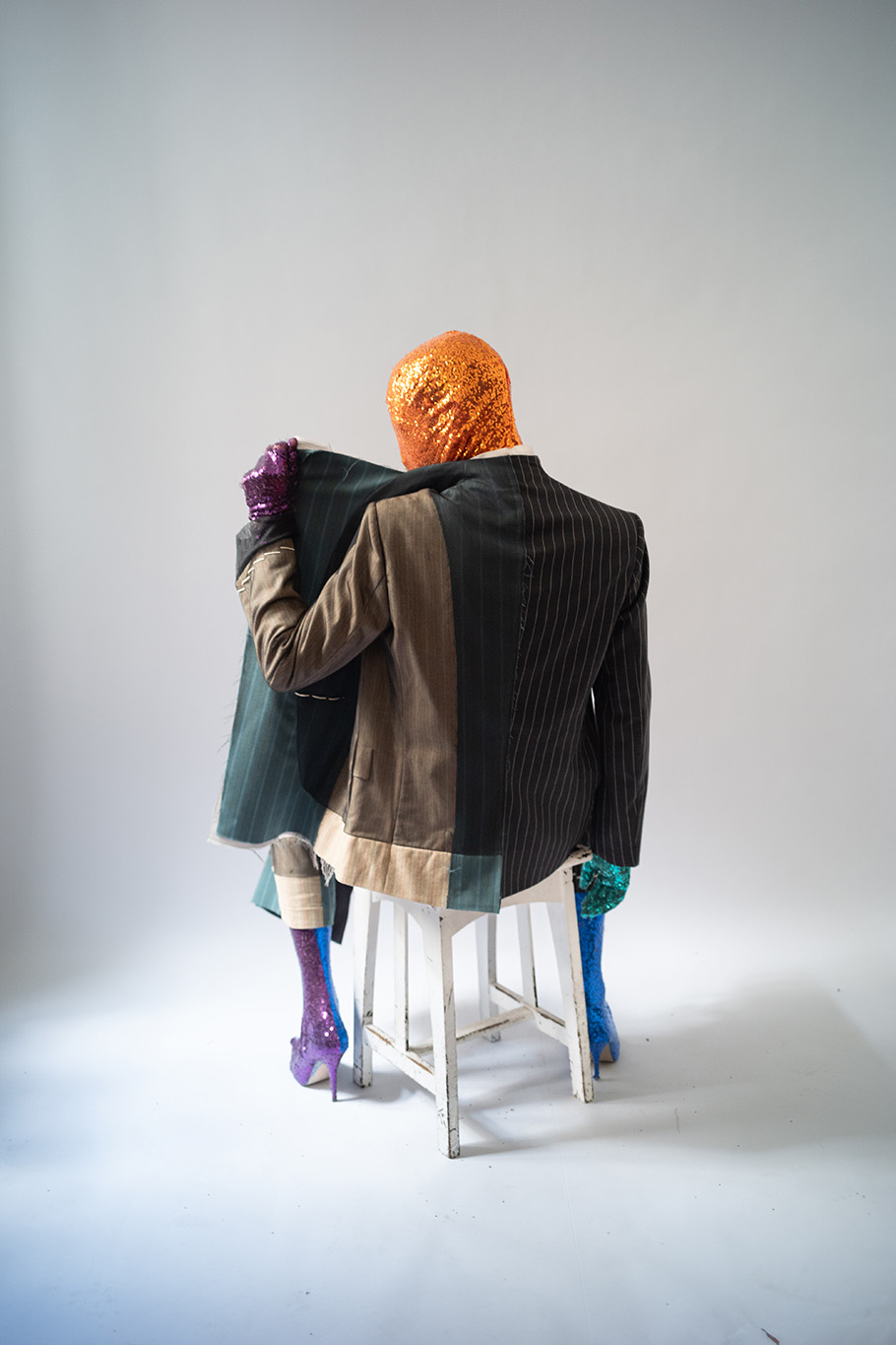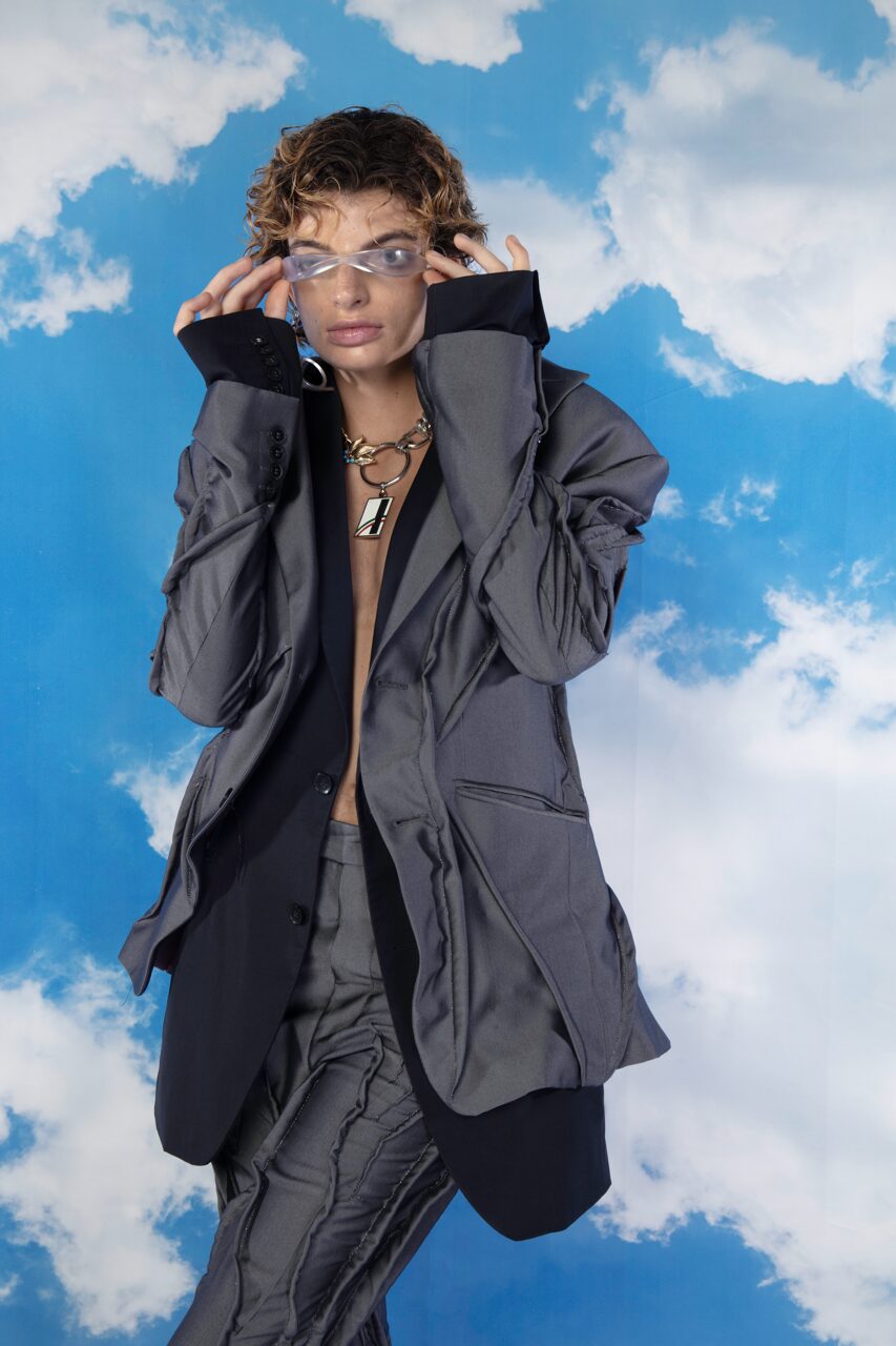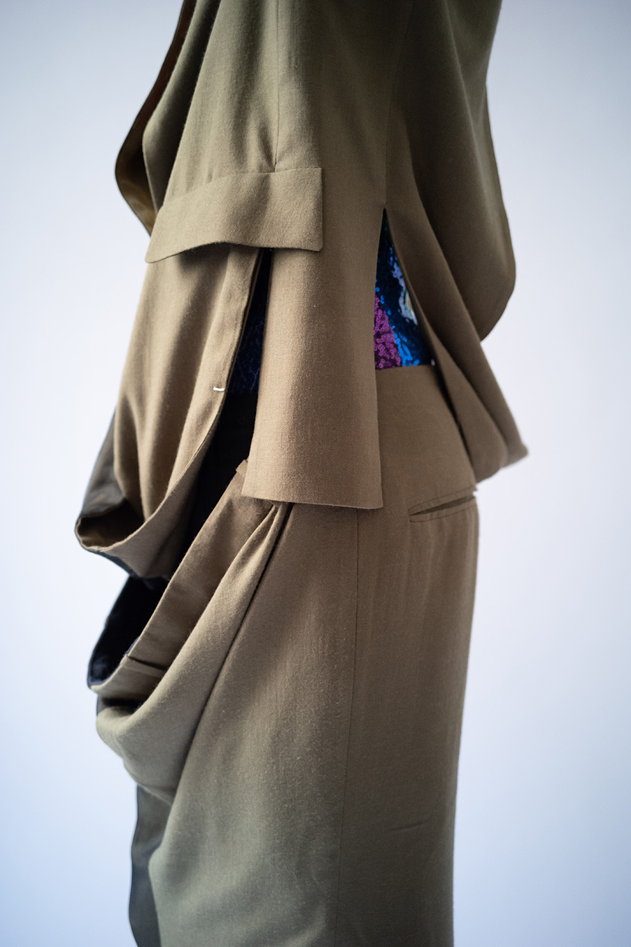 Throughout history, an ideal body has developed that people have not been able to distance themselves from for a long time. People who do not fit into this perfect image are prisoners in their body, which is not perceived as perfect by society. The hoodie serves as protection and a place of retreat from contemptuous looks and comments. Dealing with this subject has led me to develop a distorted perception of the body. Between stigmatized classical beauty, a sculptural figure develops that distorts/deconstructs the body as it is known and is meant to bring it into new dimensions. A play between space and body emerges that both relate to the body and distances itself from it. By modifying the silhouette, a positive reference is drawn to inequalities that are inherent in everybody.By creating a manifestation, the viewer is encouraged to distance himself from the „normal“ ideal image. The wearer must turn away from familiar body shapes in his appearance, which creates a stadium between sculpture and human being. They should feel comfortable and fade out the reduction to society’s ideal image.