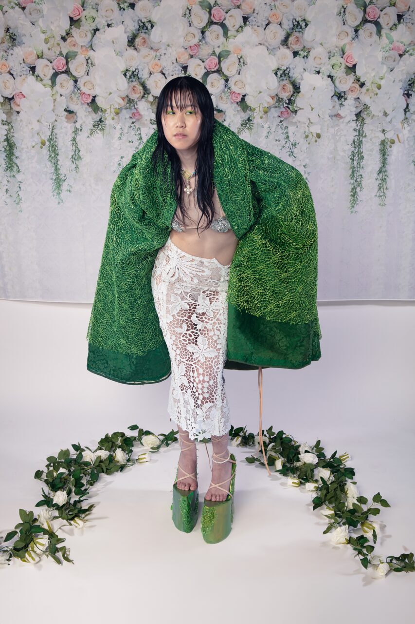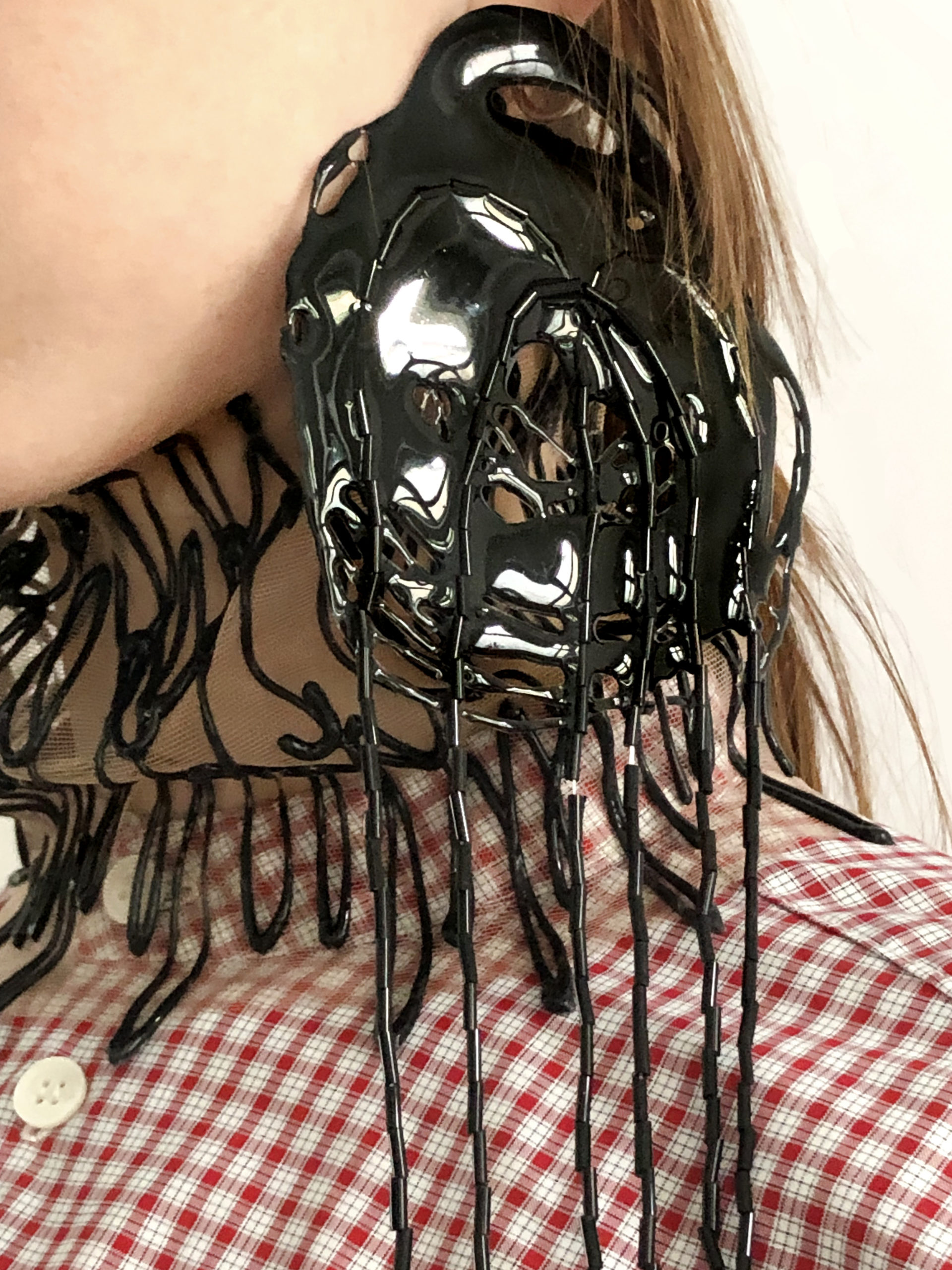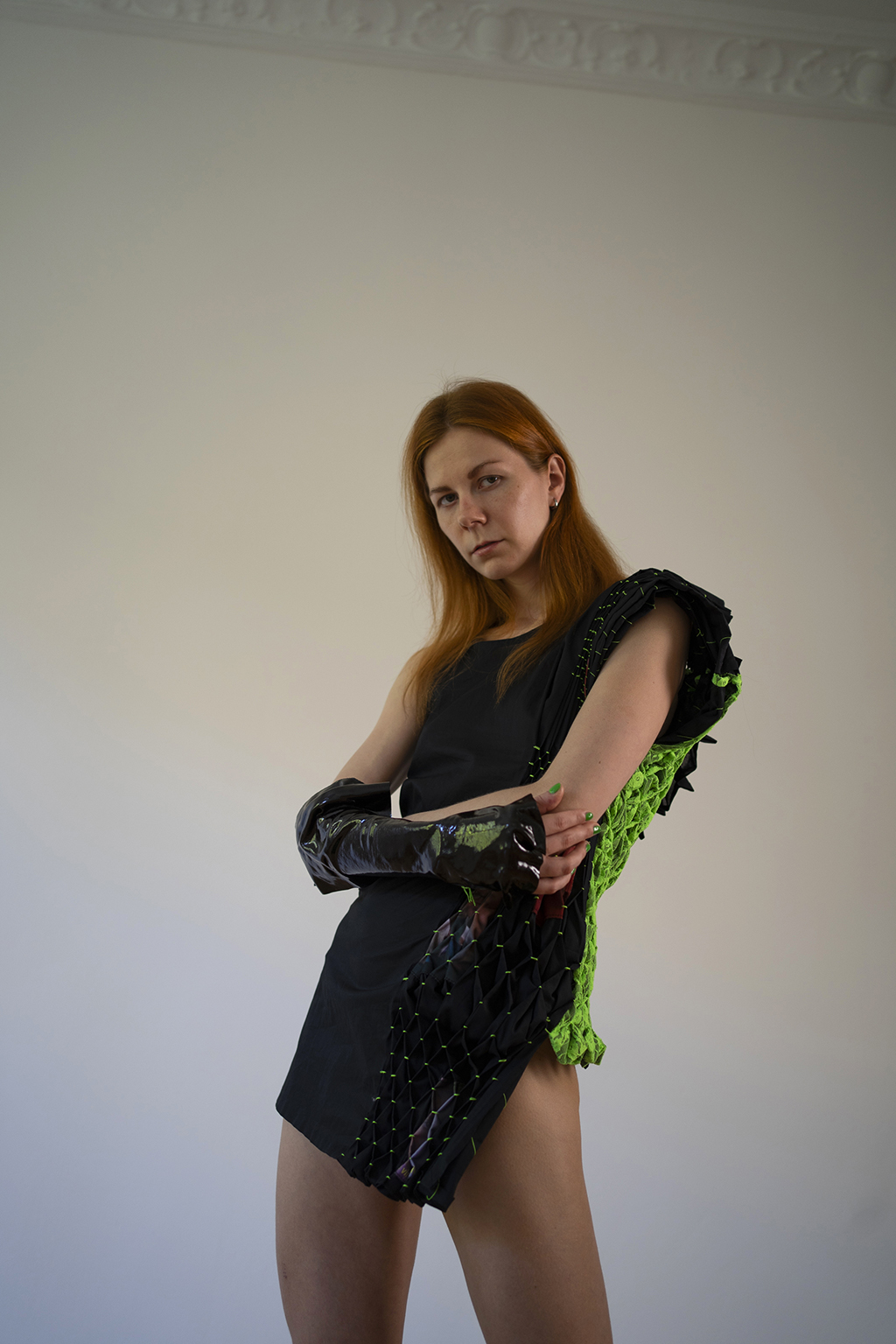 The skin offers us protection and is the visible outer shell of living beings. As well as the hoodie as a second layer becomes a very personal, own part of our body, of our existence. Safe, protected, as if fitted to one’s own body, the garment exists on and connected to the human being. The play between the natural and an outer shell, becomes one.My project deals with the human surface in its biological form, designed by self-produced bioplastics that, like us, will eventually decay. Inspired by nature, water and waves, the garment wraps asymmetrically and organically around the body. It is reminiscent of a mystical transformation of the human being in the hoodie. This installation represents the excursion of bio-based materials, which are our future, with the abstract representation of the human form.