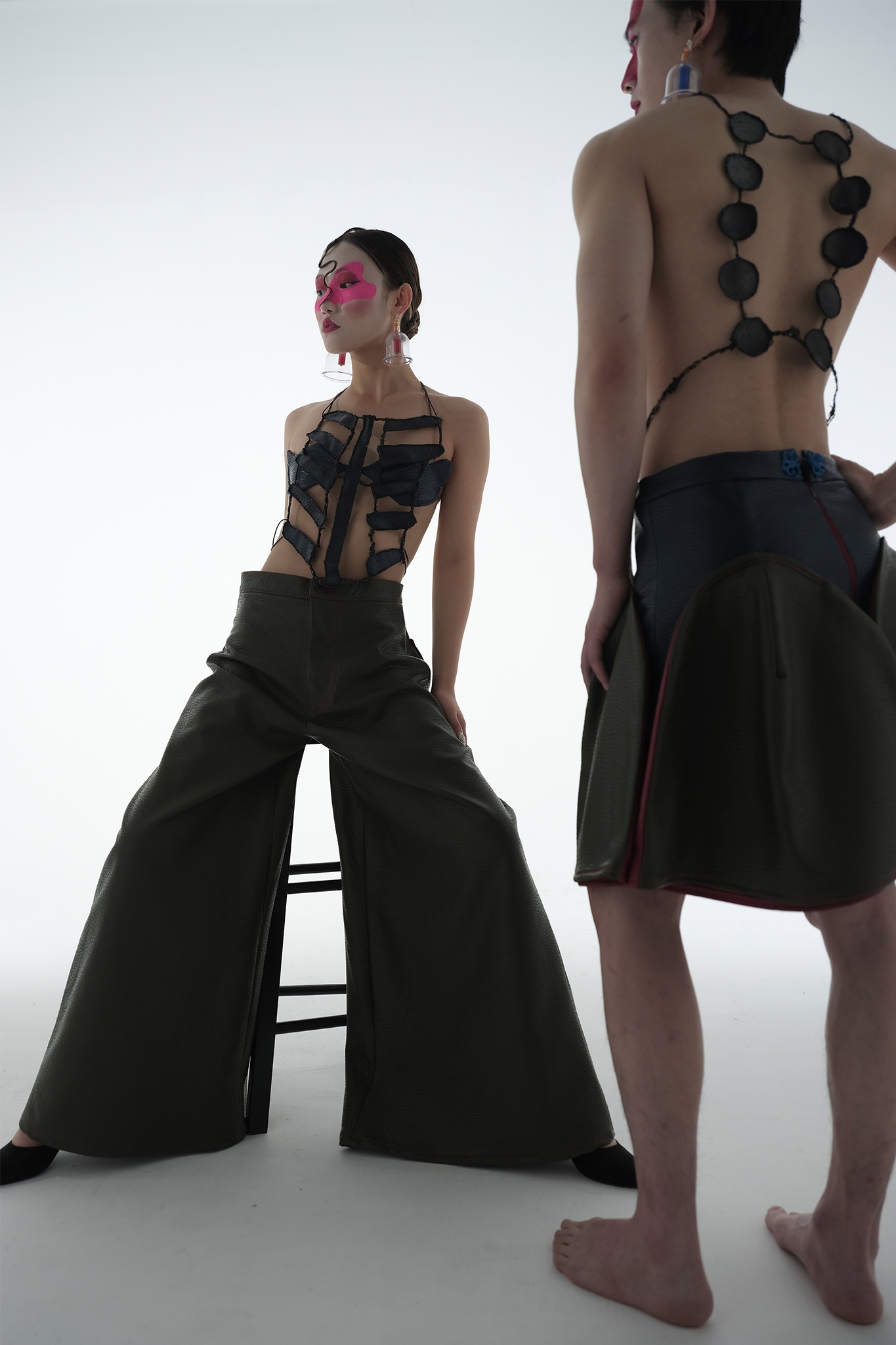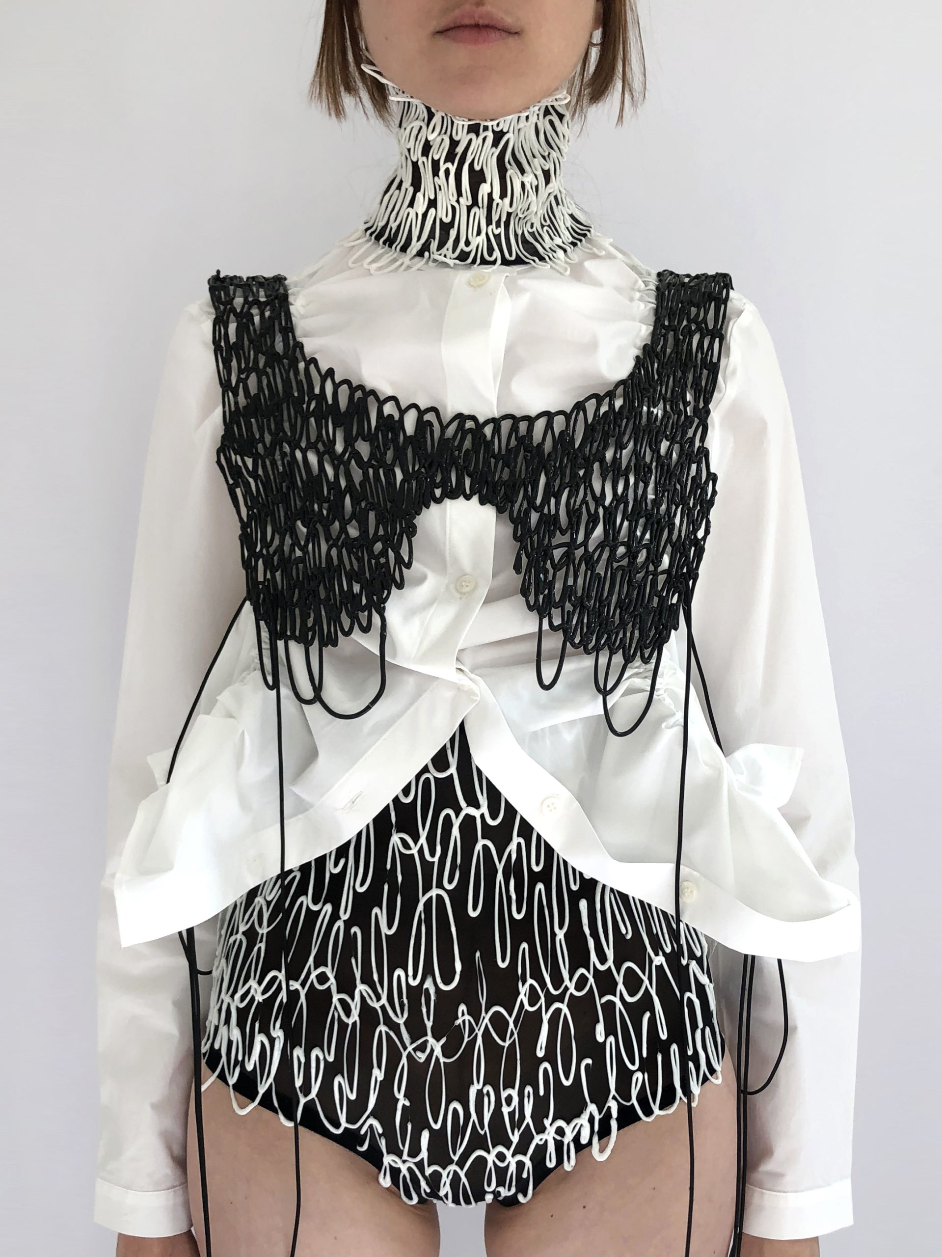 The simplest form of concealment can be done by deforming the body with the help of clothes. Among these is the contour-dissolving hoodie. In contrast, the corset puts the focus on sexualized limbs, additi-vely is straining the body and leaves drawings in the name of restrictive gender roles. The work deals with the process of differentiation and becoming aware of one‘s own gender identity and the accompany-ing dysphoric relationship to the body. The original points of view of the corset are intentionally shifted to other points.