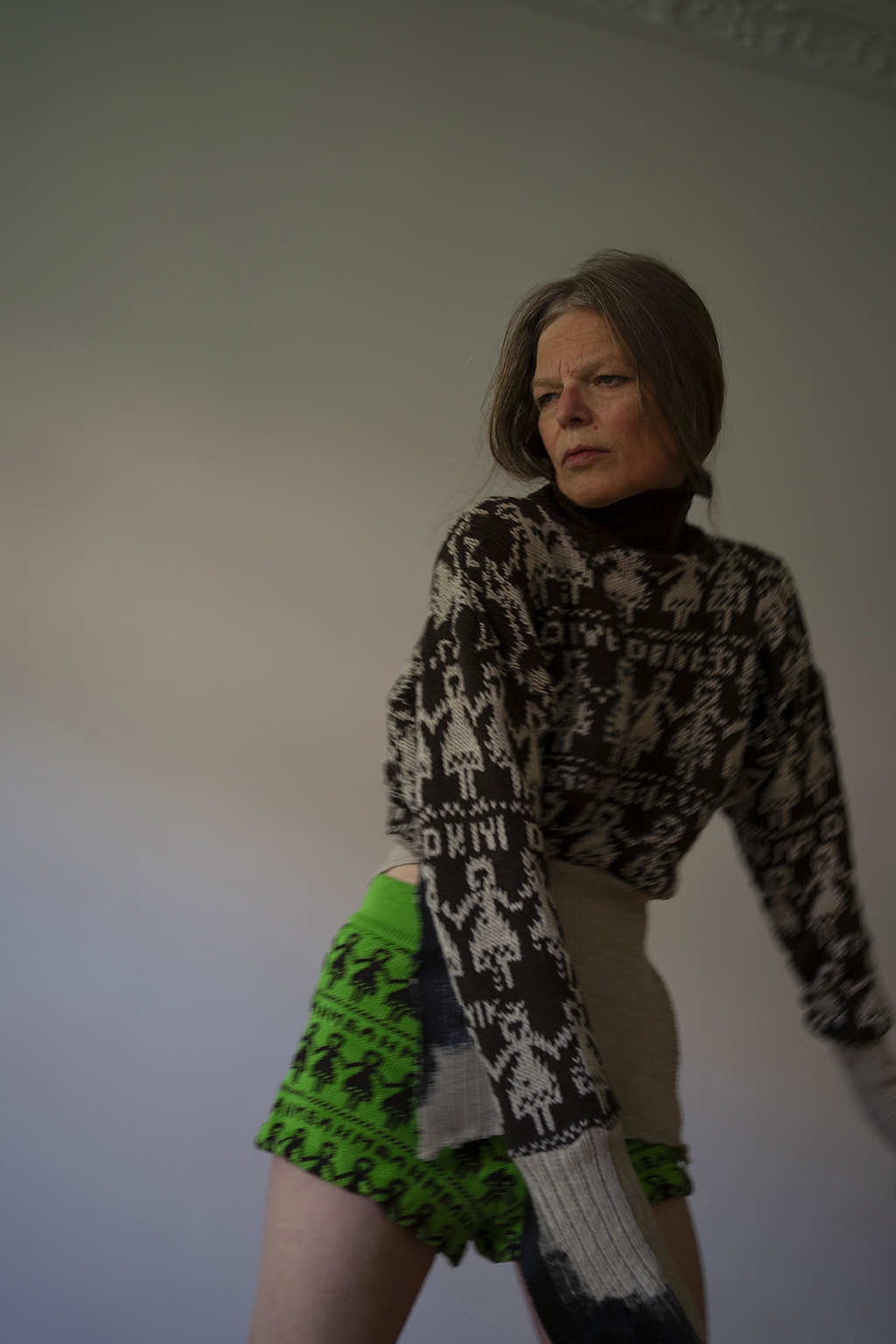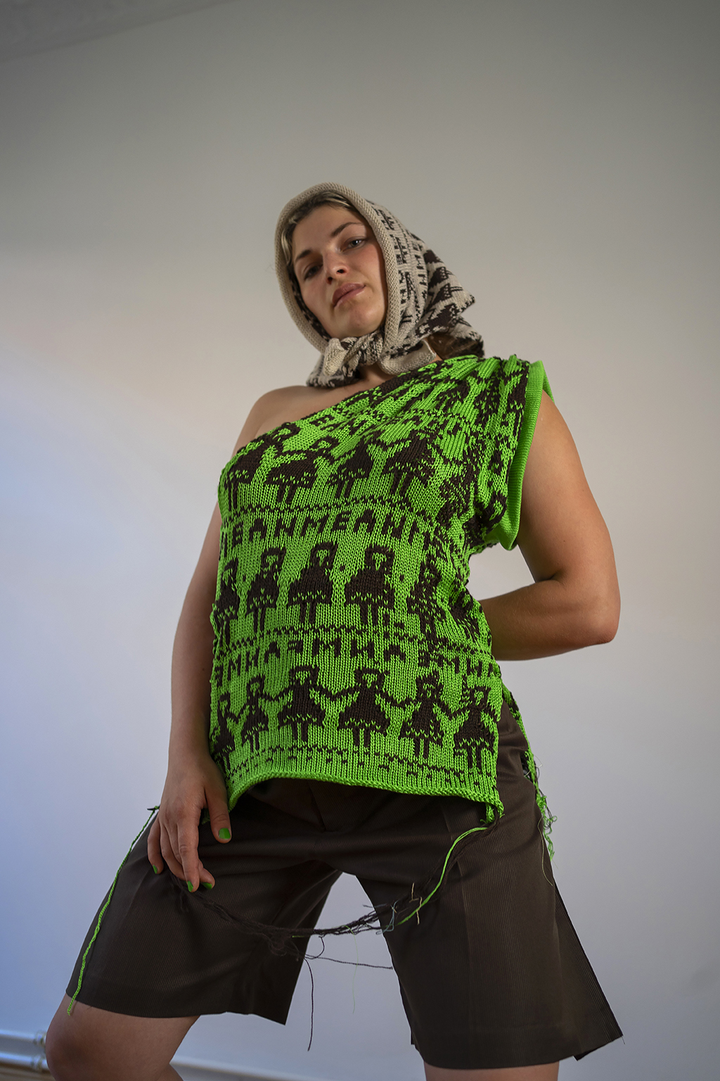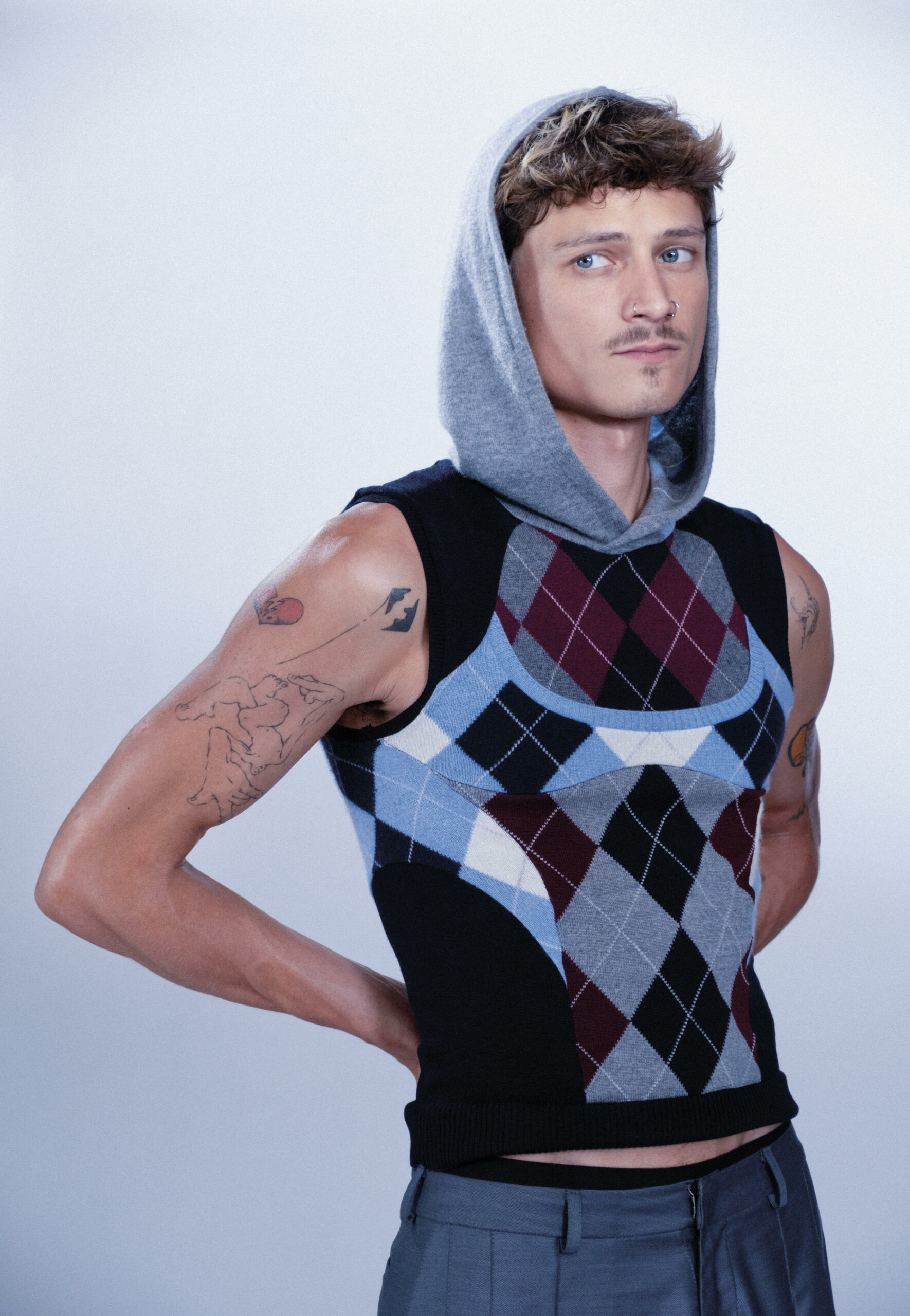 Reminiscent of the page 6 it girls, this deconstructed three-piece knit hoodiebrings back memories of Paris Hilton, Gwen Stefani and the like.With the tiny kangaroo-pocket handbag, a mix of textures and color and abutterfly inspired cut. But it’s made for the it-girls of today. Tik-Tok is their realm and they grew up with strong fashionistas as their childhood idols.It is inspired by the historical fact that women first wore hoodies in the 17th century to be able to go to their rendezvous unrecognized. Such a girl might consider a classical hoodie unflattering, unfashionable andinterfering or hindering a good posture.The hand knitted chain hood helps to keep their privacy safe but is still able todisplay their love for art, fashion, jewelry and self-made pieces.