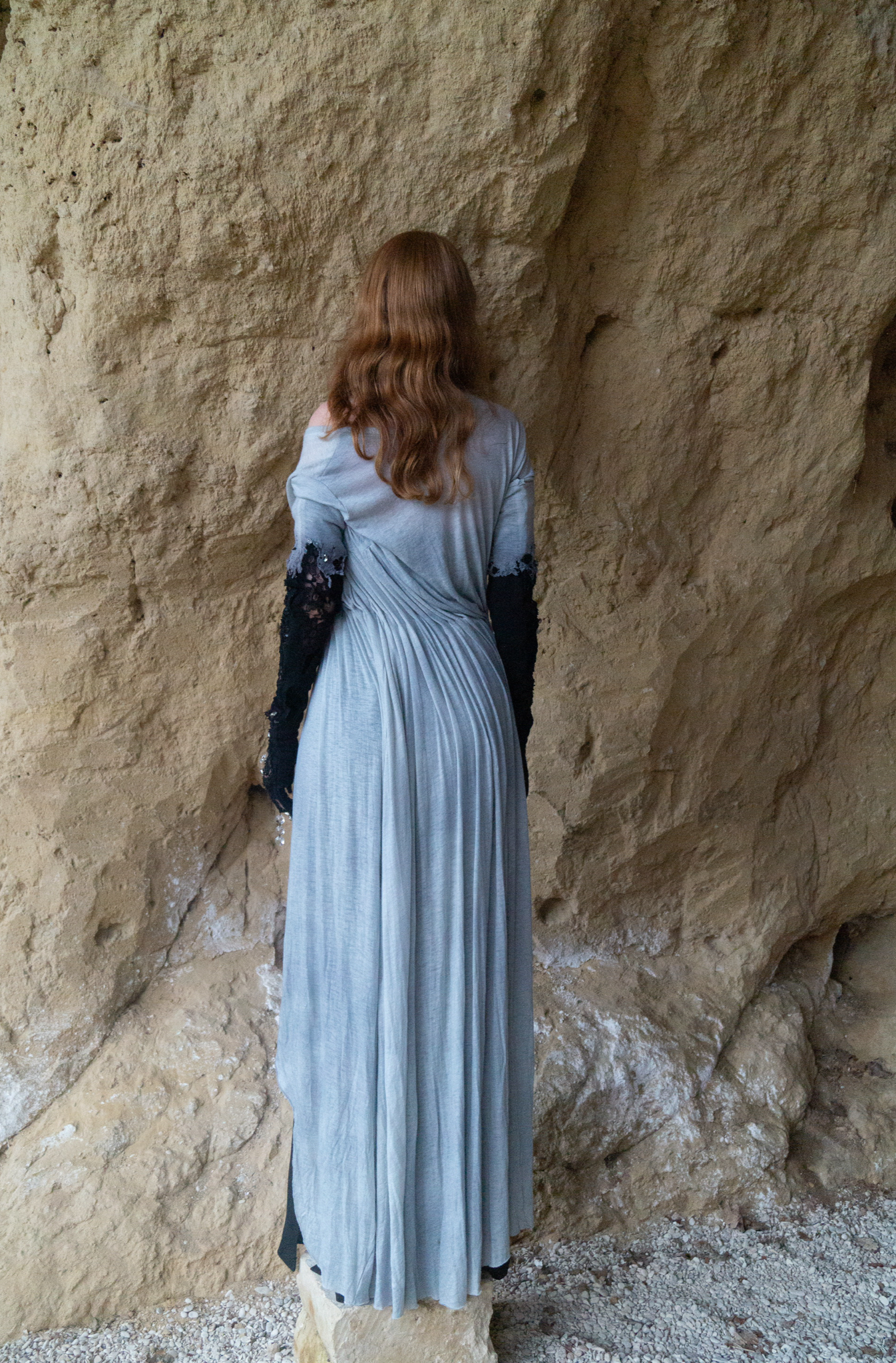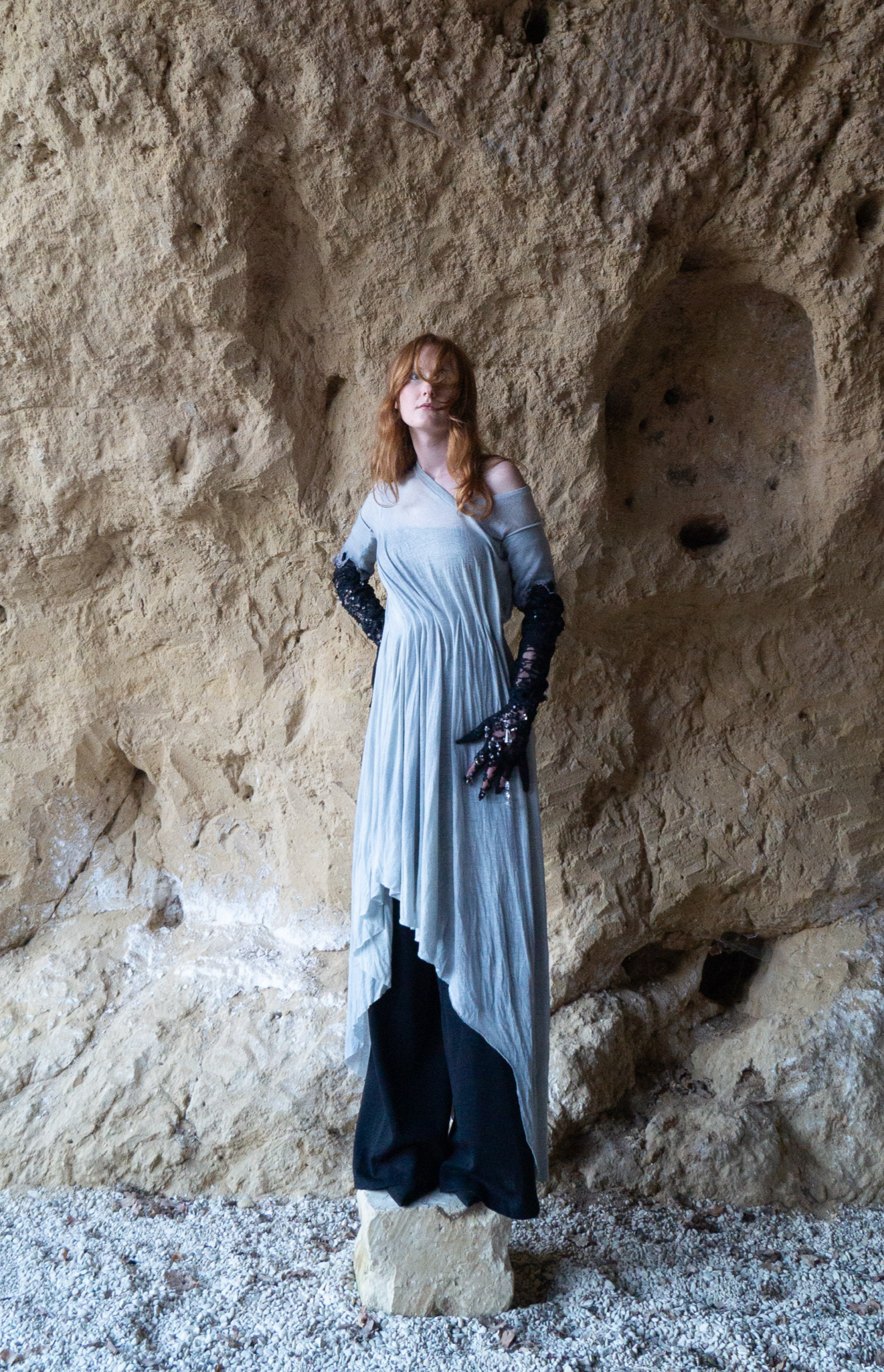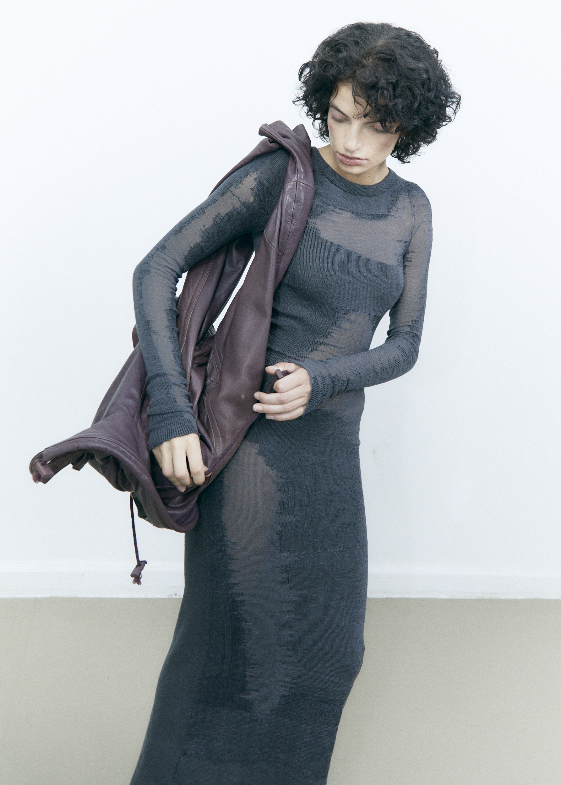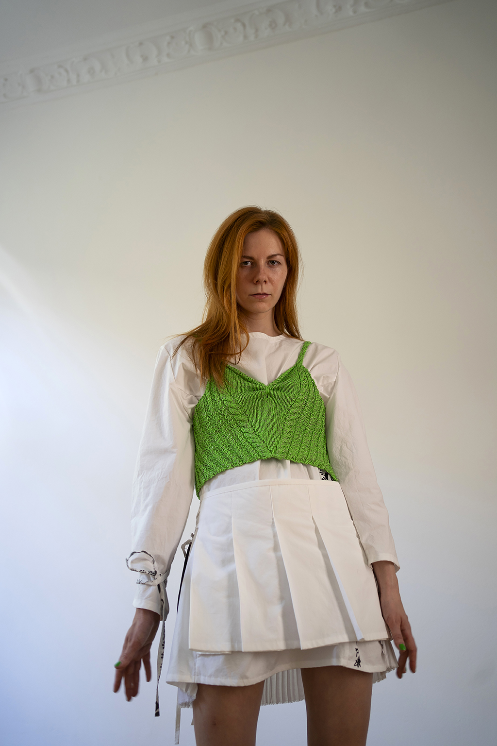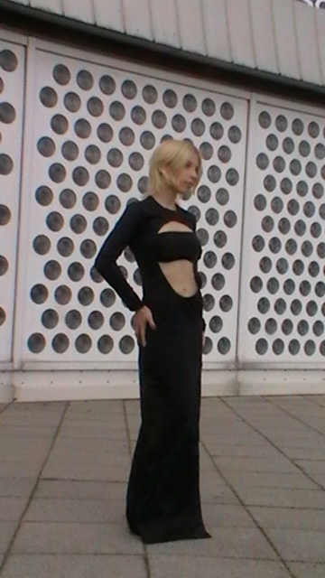 Der Entwurf verdeutlicht das Gefühl von Gewicht in meinem Inneren.Es bedeutet das Maß an Verantwortung, die ich fühle oderder Grad der Atmosphäre, die ich empfinde, wenn ich bestimmte Dinge sehe.Der Oberkörper (Weste) des Hoodies erscheint schwer, indem breit geschnittene Jerseystreifen aus einem alten Kleid neu verstrickt wurden.Das Wesen des Kleides bleibt somit in einer anderen Form erhalten.Der Kapuzenteil des Hoodies ist großzügig geschnitten und besteht aus leichtem und dehnbarem Jersey. Die Silhouette sollte leicht beginnen und in ein Wechselspiel der Schwere und Leichtigkeit der Materialien übergehen.Der Rock zeigt gewissermaßen eine grobe rechteckige Form. Durch die Beschaffenheit der Seide klebt der Rock am Körper und zeigt die Silhouette im Inneren.Um den Rock mit dem Oberkörper zu verbinden, habe ich eine dünne Kette verwendet.Ich mag die Harmonie der leichten Seide verbunden mit der dünnen Kette.Fein aber stark, verschwommen und dennoch sicher.