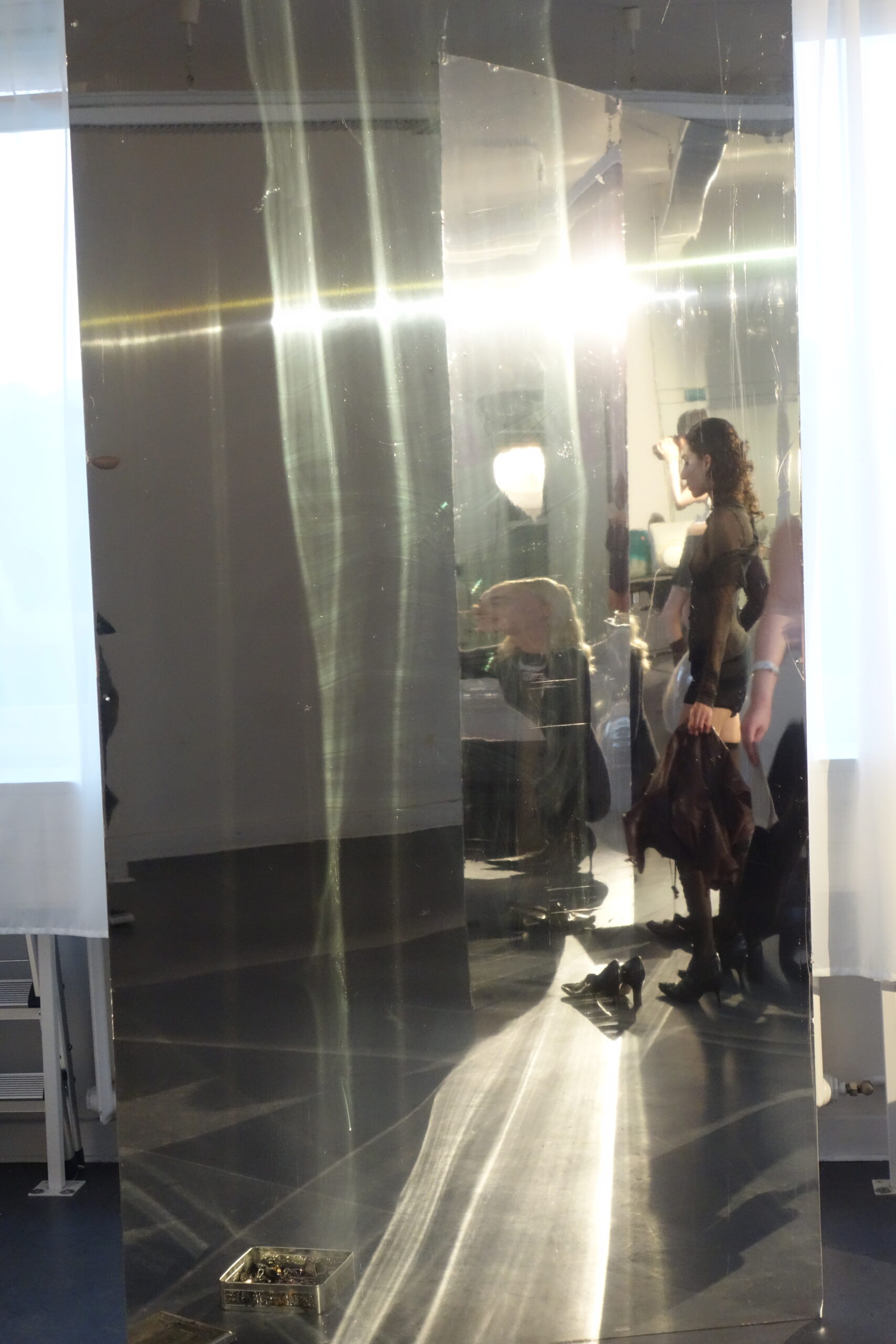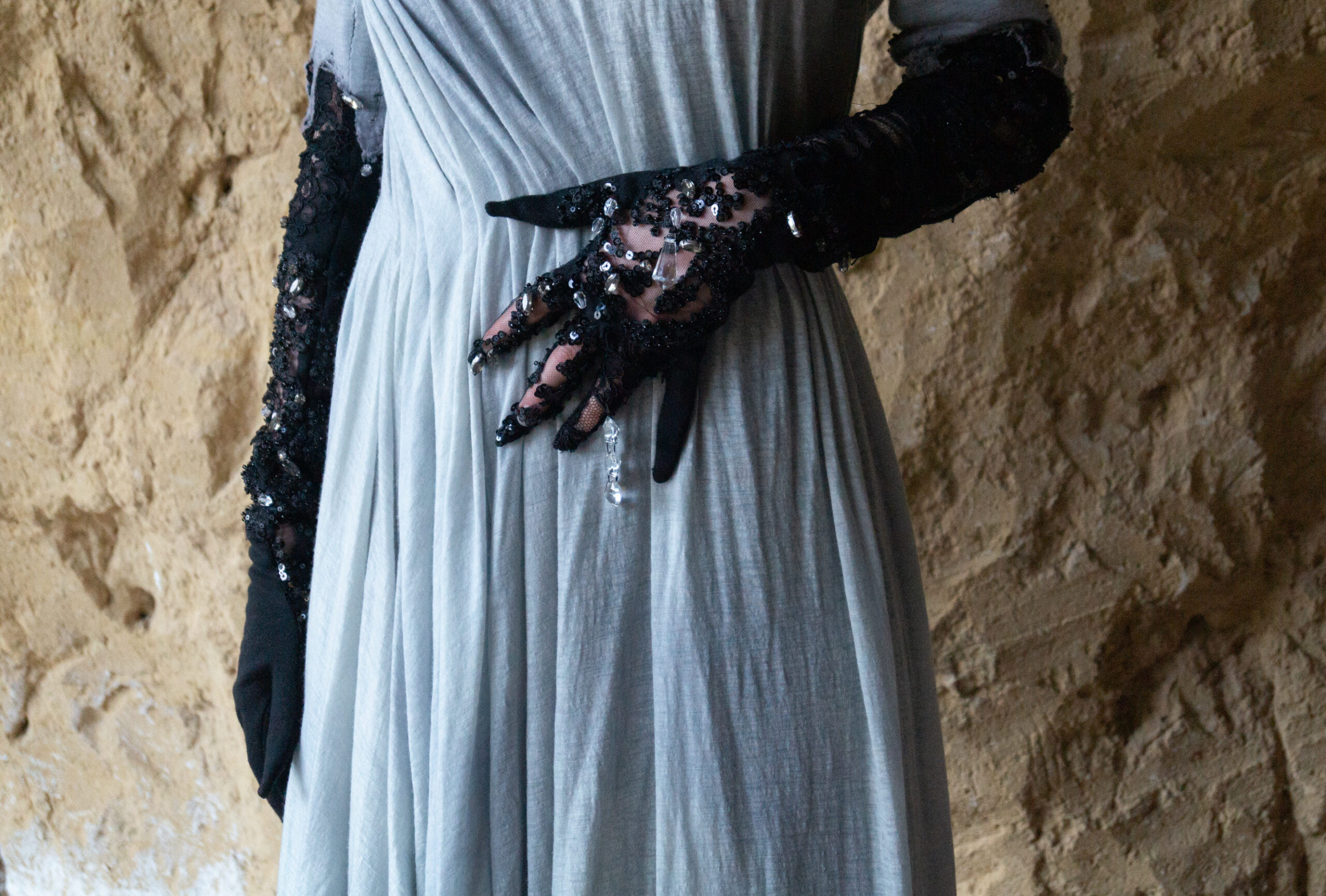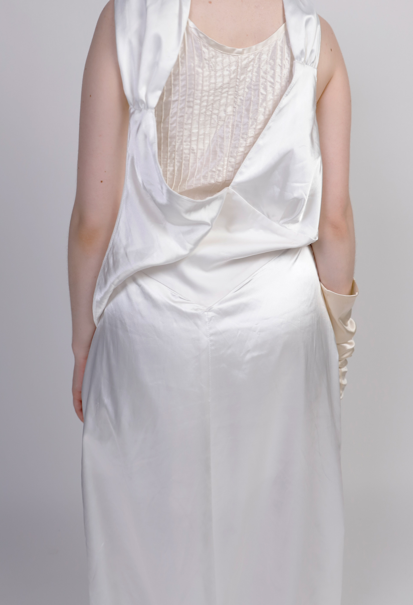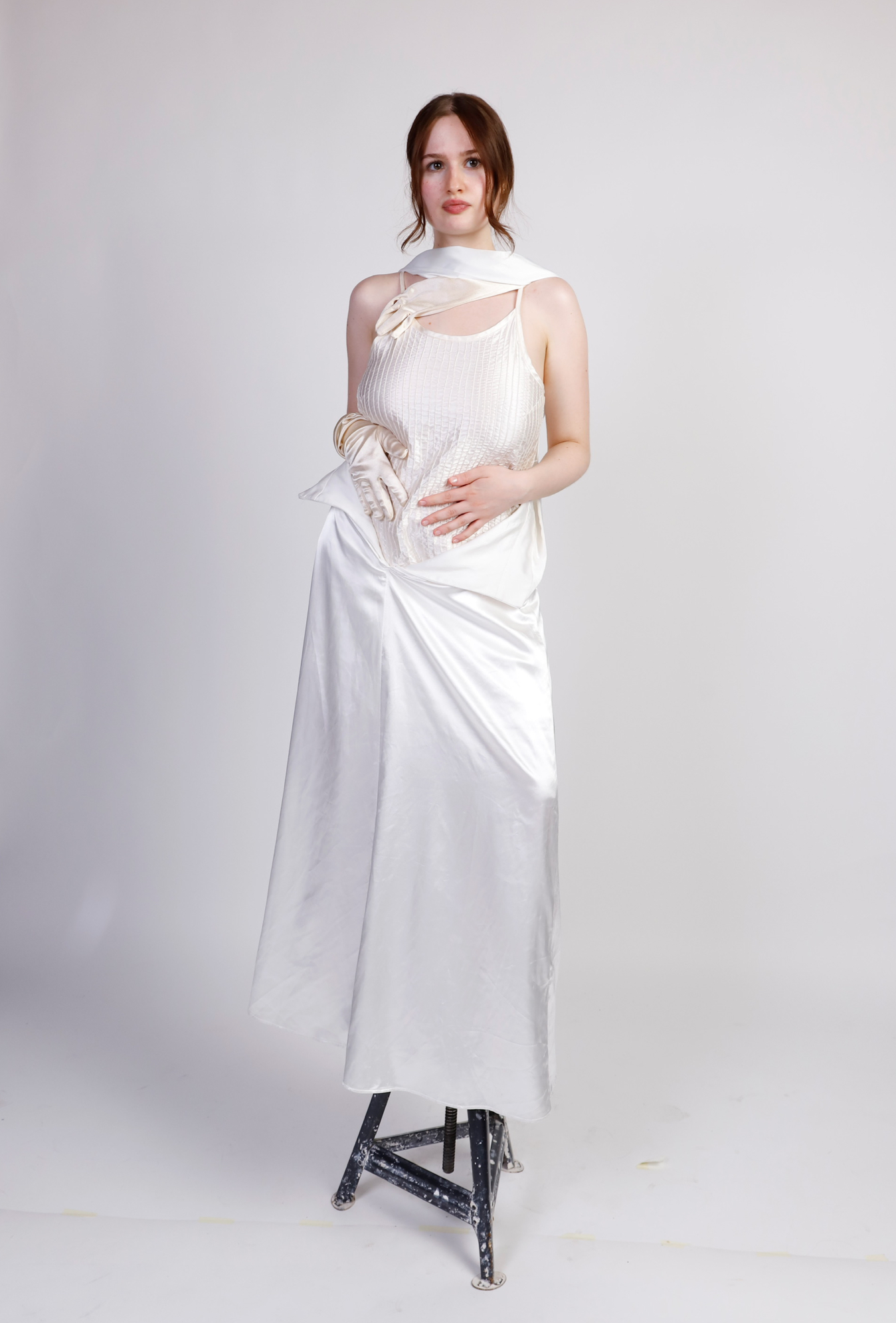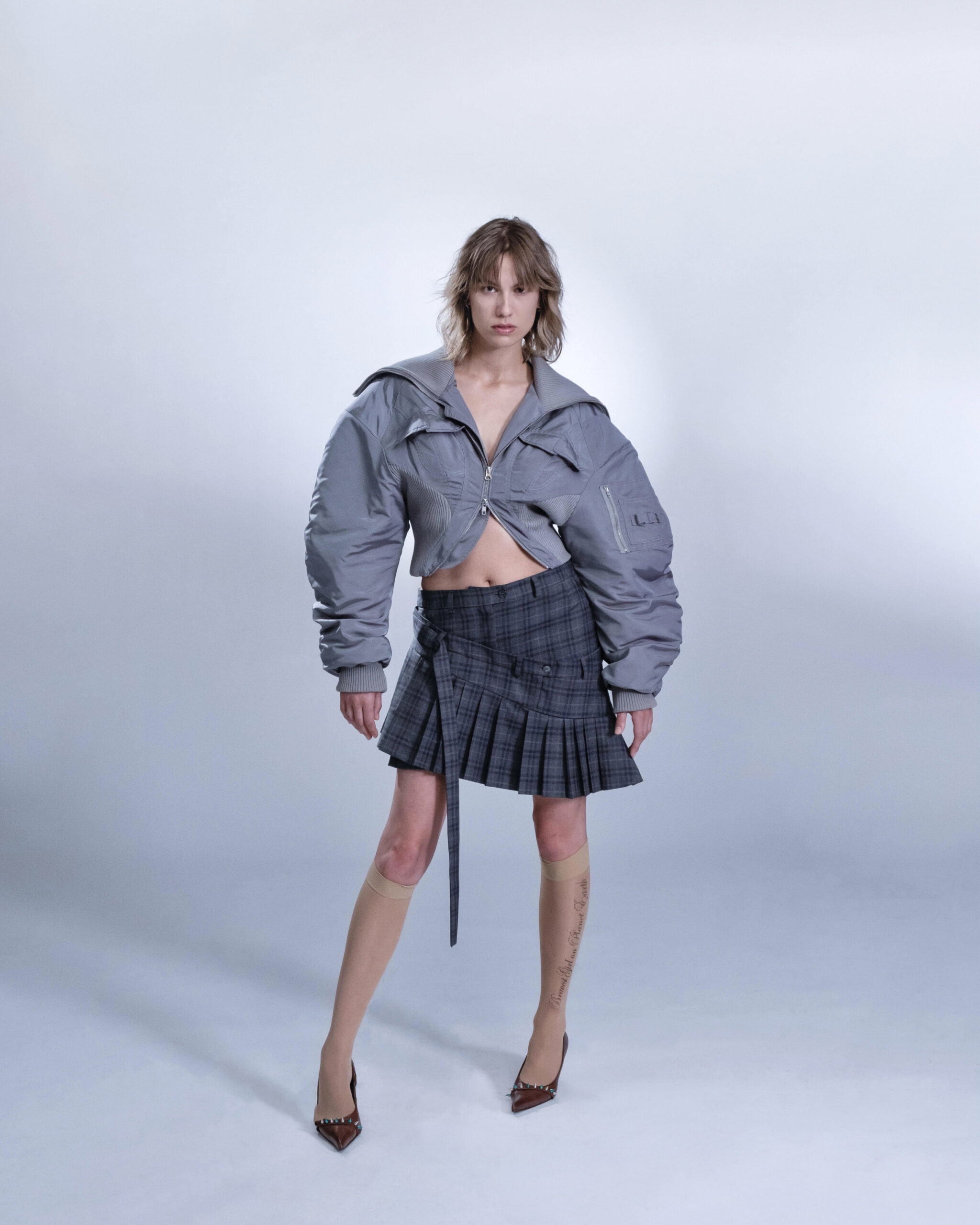 Der Entwurf verdeutlicht das Gefühl von Gewicht in meinem Inneren.Es bedeutet das Maß an Verantwortung, die ich fühle oderder Grad der Atmosphäre, die ich empfinde, wenn ich bestimmte Dinge sehe.Der Oberkörper (Weste) des Hoodies erscheint schwer, indem breit geschnittene Jerseystreifen aus einem alten Kleid neu verstrickt wurden.Das Wesen des Kleides bleibt somit in einer anderen Form erhalten.Der Kapuzenteil des Hoodies ist großzügig geschnitten und besteht aus leichtem und dehnbarem Jersey. Die Silhouette sollte leicht beginnen und in ein Wechselspiel der Schwere und Leichtigkeit der Materialien übergehen.Der Rock zeigt gewissermaßen eine grobe rechteckige Form. Durch die Beschaffenheit der Seide klebt der Rock am Körper und zeigt die Silhouette im Inneren.Um den Rock mit dem Oberkörper zu verbinden, habe ich eine dünne Kette verwendet.Ich mag die Harmonie der leichten Seide verbunden mit der dünnen Kette.Fein aber stark, verschwommen und dennoch sicher.