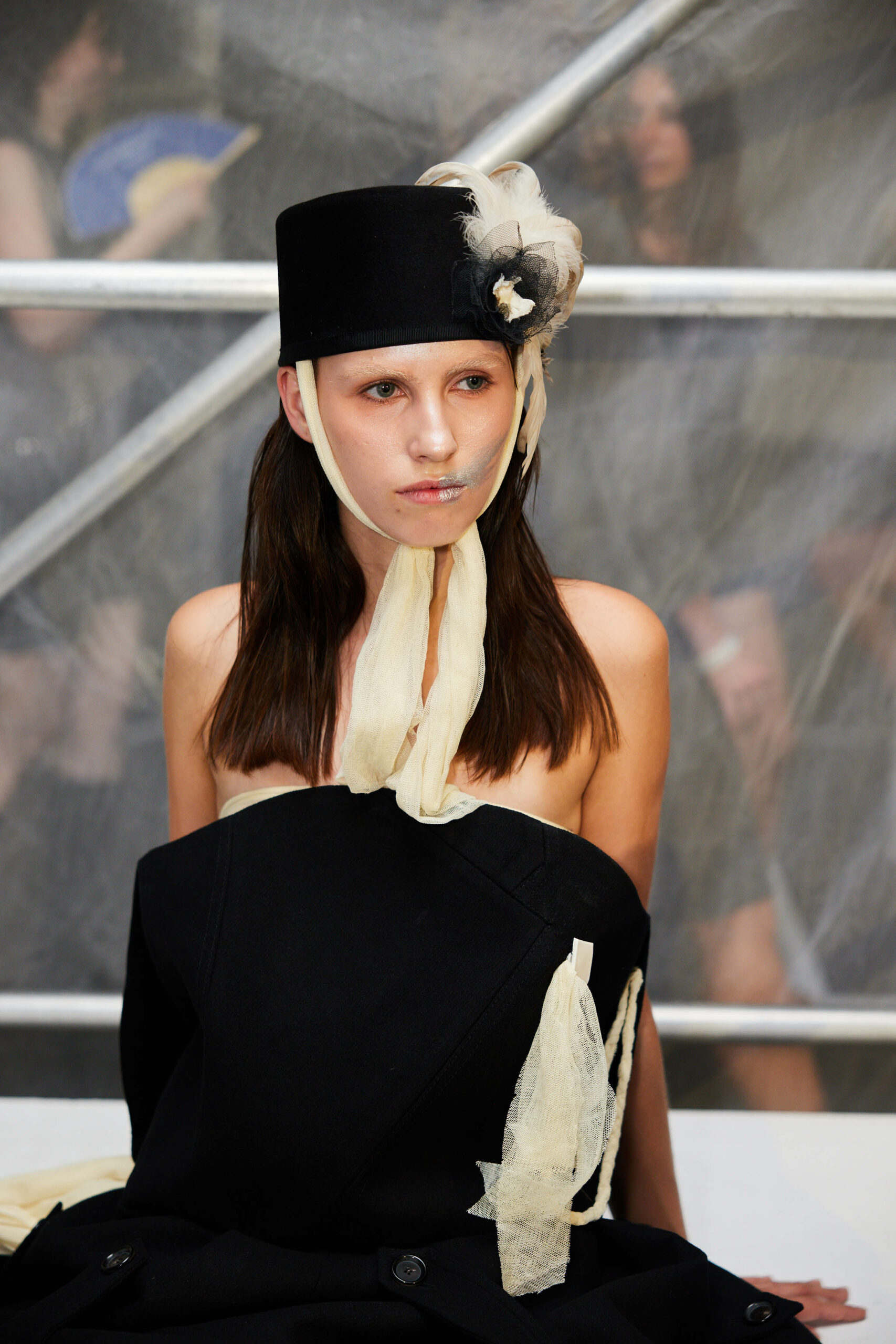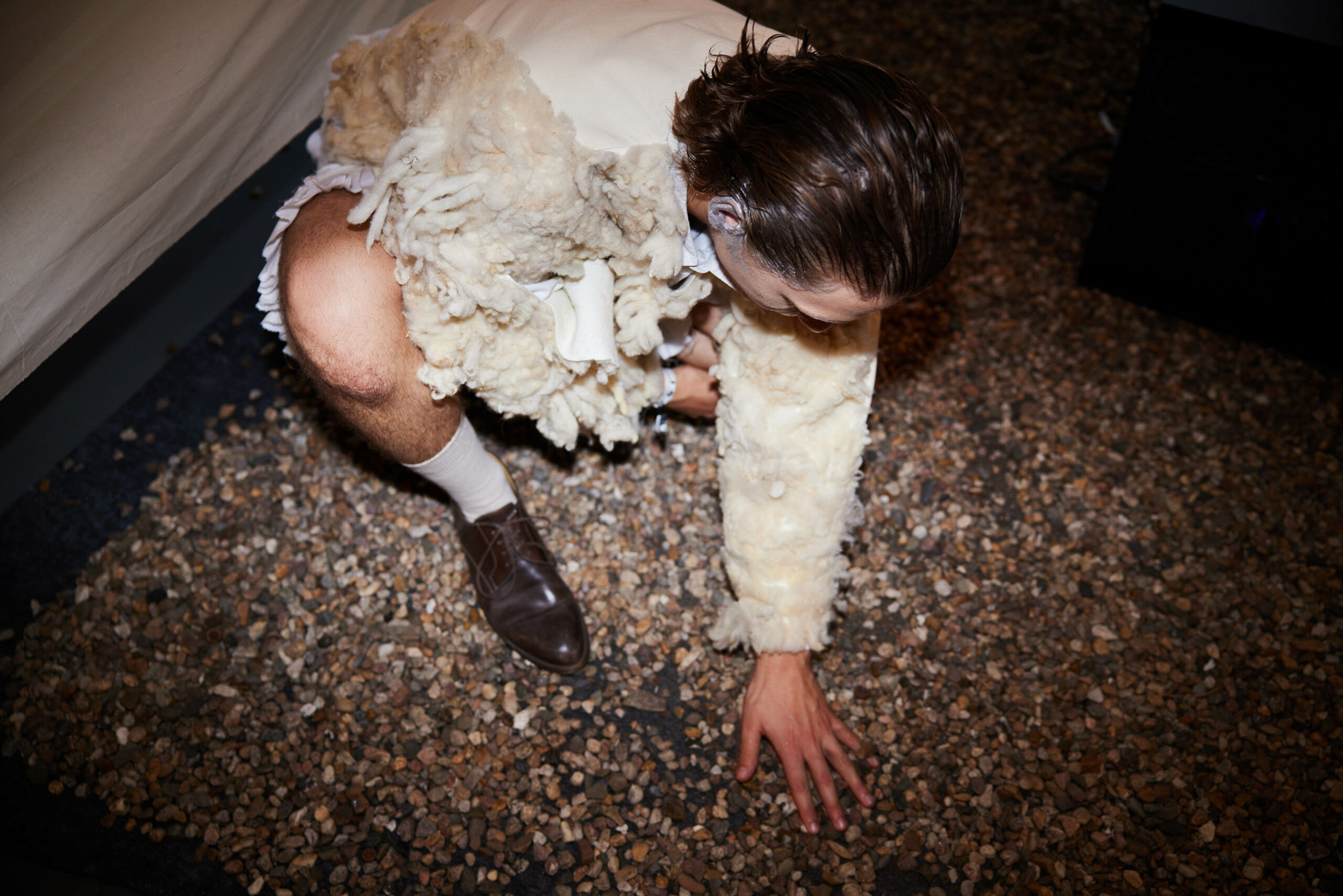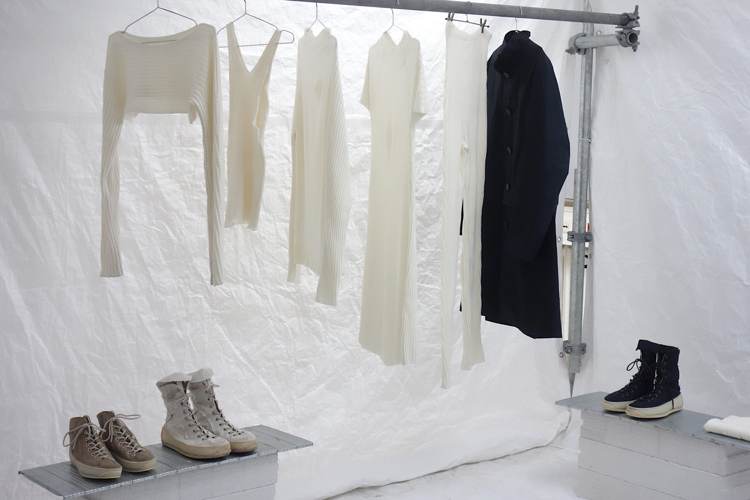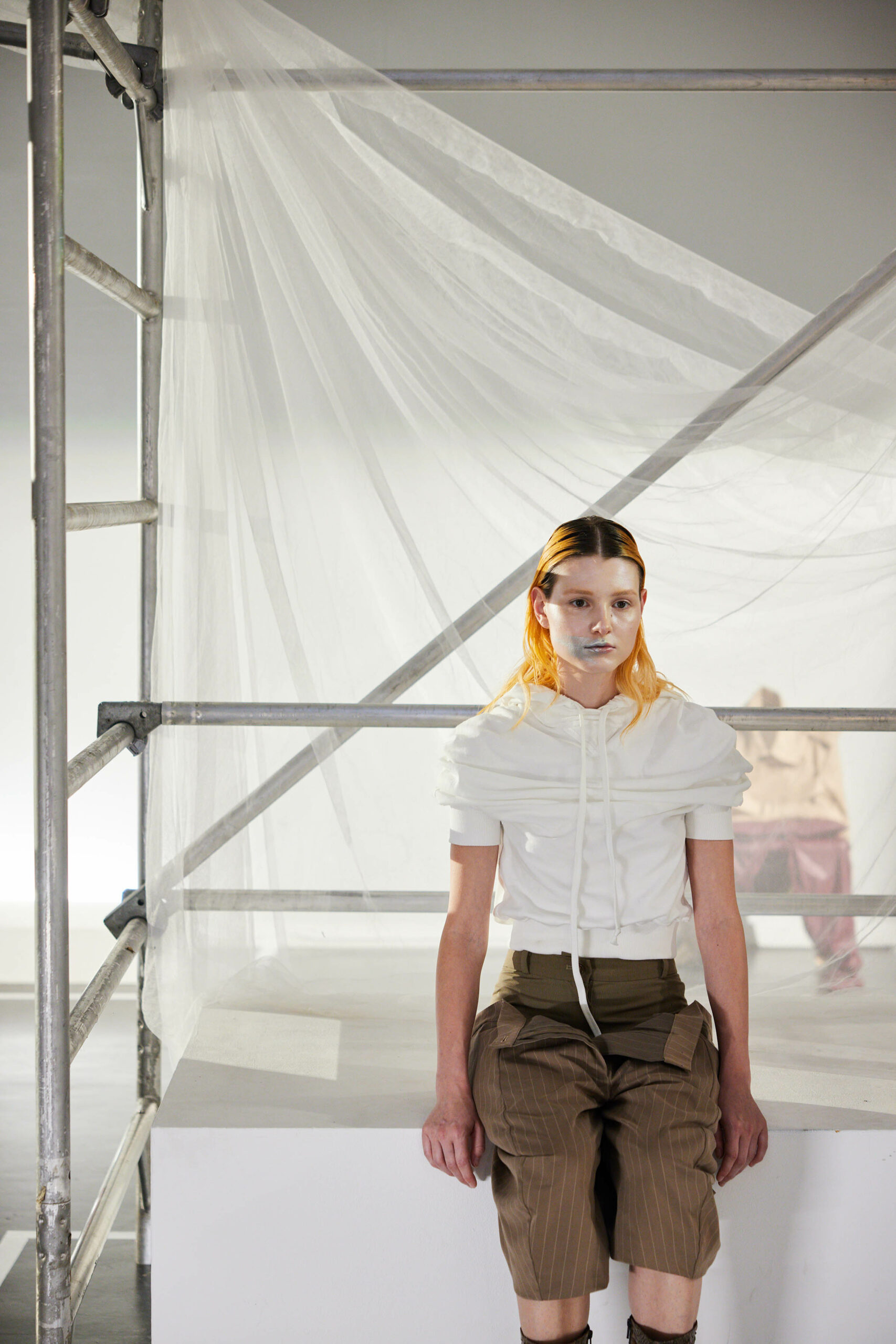 „Ärmel hoch, Hose runter“ geht ehrlich mit der Rolle der Workwear als Dekoration um und entzieht ihr konsequent den Nutzen. Medizinische Schuhe werden zu hoch um drin zu laufen, Schutzhandschuhe werden aufgeschnitten und Helme werden weich. Die Kapuze wird zu dem dekorativen Element, dass sie eigentlich schon immer war. Und einige Elemente erscheinen auch nur, weil sie schön sind – denn nicht alles in Menswear bedarf einer Erklärung.