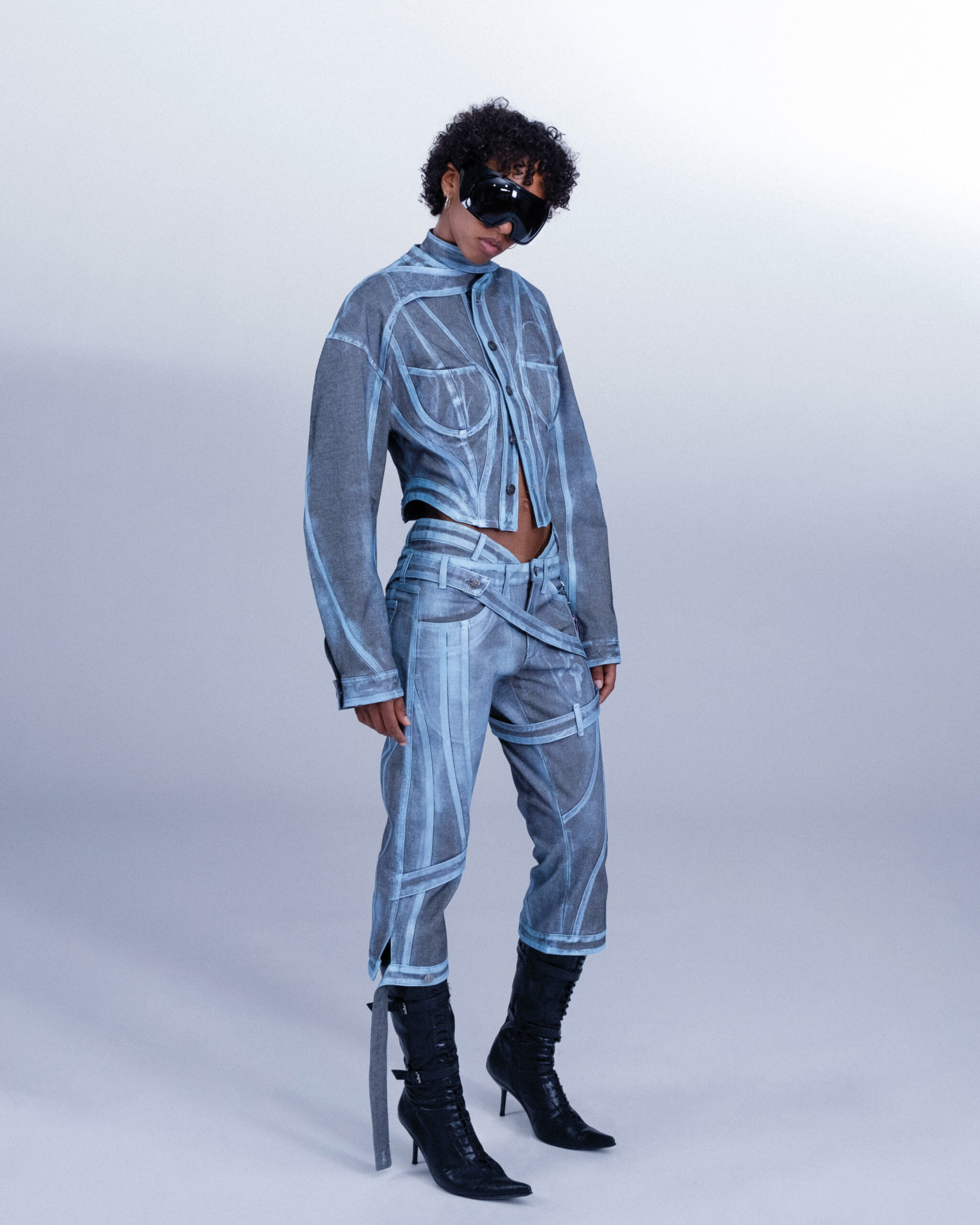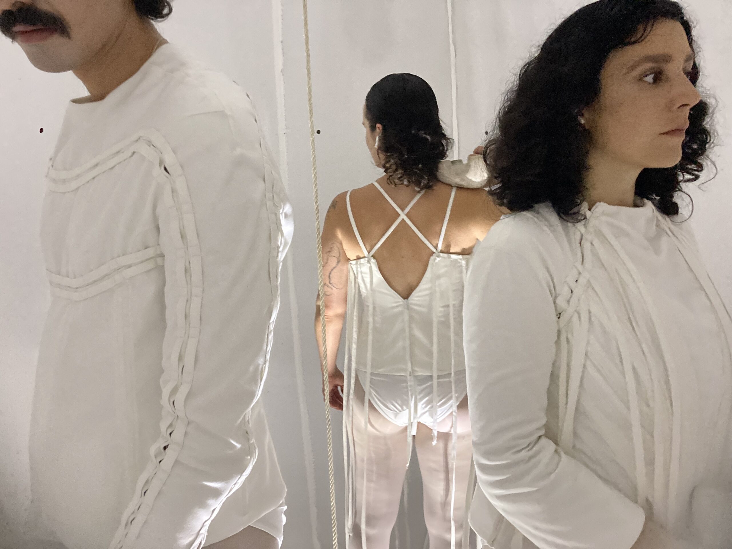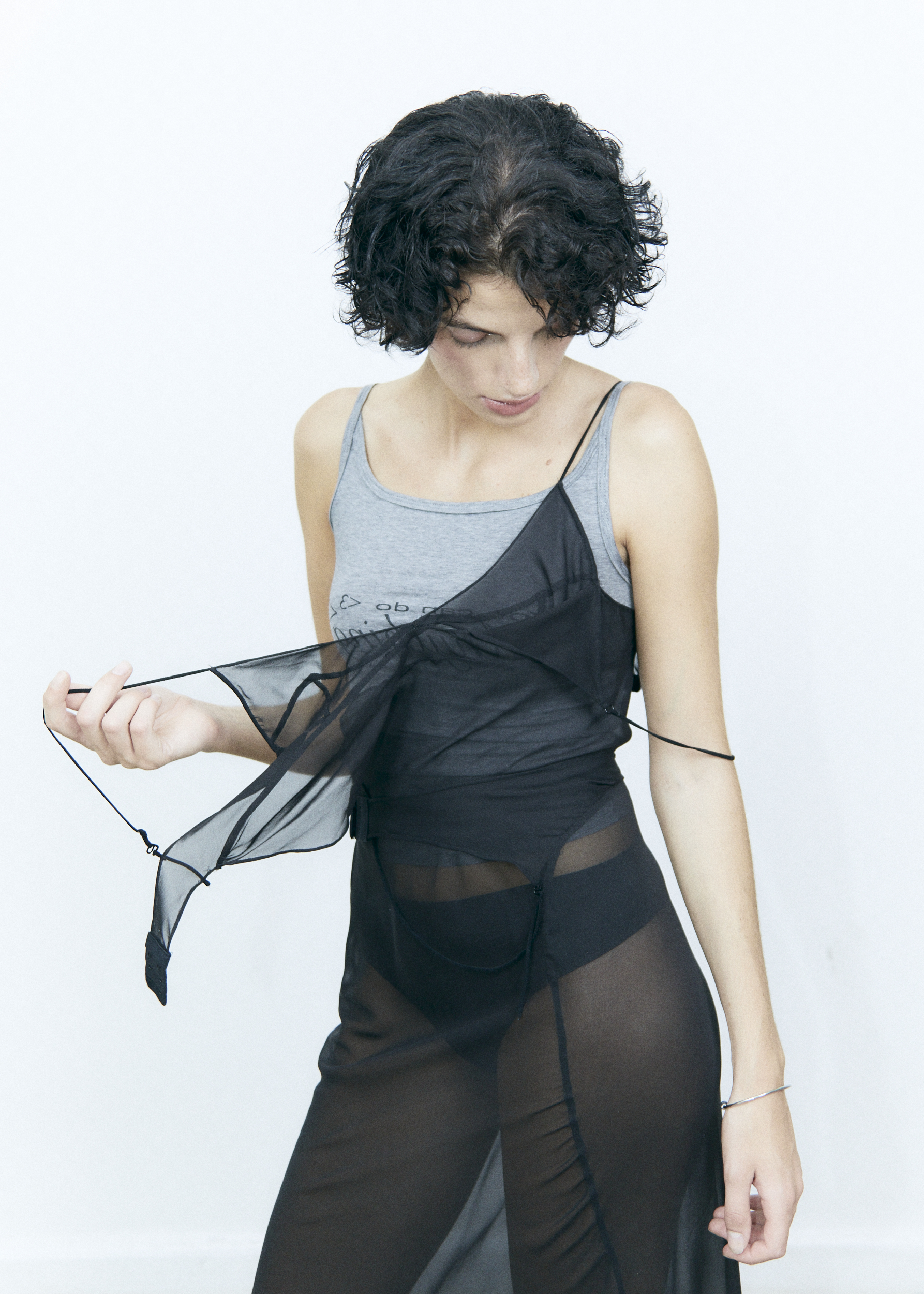 Playing with covering and veiling the body in a society where one is sexualised and sexually objectified, often depending on what and how much one shows off oneself.How do I deal with sexualization? How do I choose to act in this context every day? I seek balance anew every day.The hoodie is the starting point of the veiling. Large opaque volumes drape over the body, making the actual shape of the body unrecognizable. In contrast, tight mesh garments enclose the body tightly and not only leave it visible, but put an additional focus on it.The two materials play with each other, wrestle with each other. They take on the qualities of the other. A negotiation between veiling and unveiling.