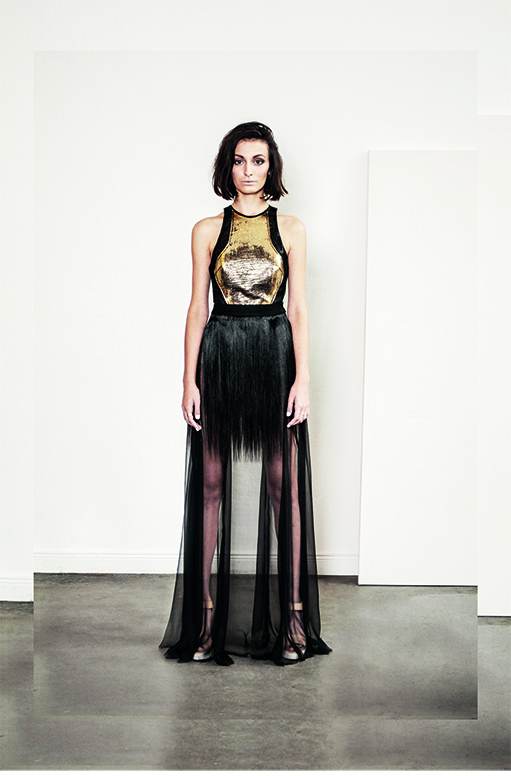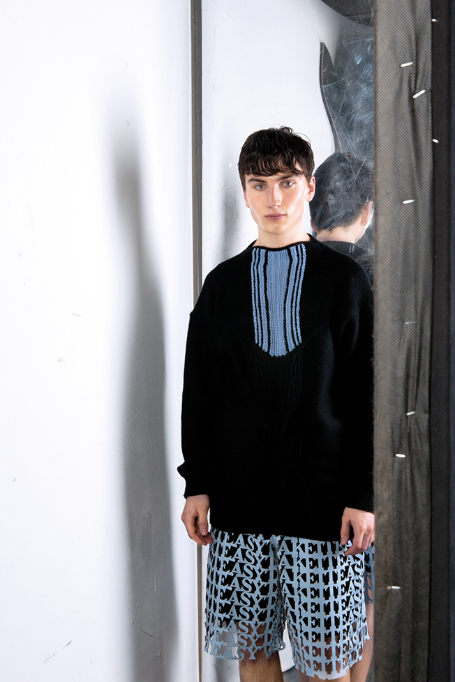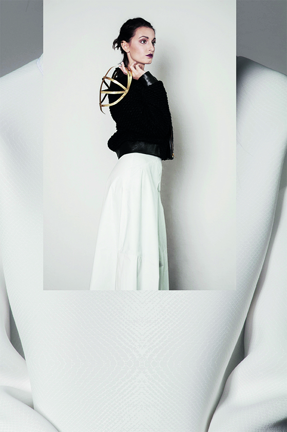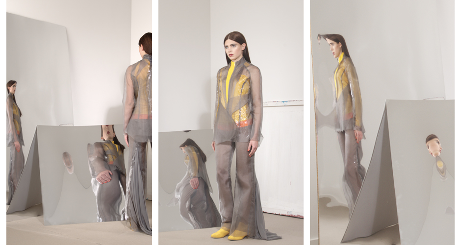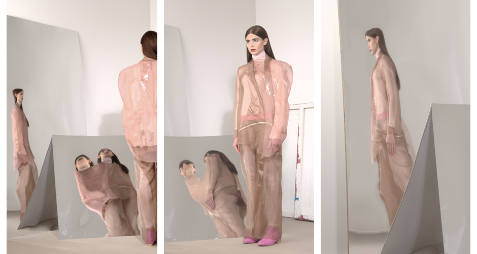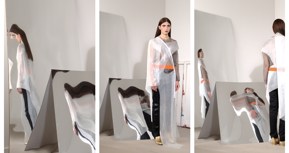 Das Werk des Malers Francis Bacons ist von Gegensätzen geprägt – Intimität und Verletzlichkeit gegen Brutalität – elegante Ästhetik gegen Schlachthausszenen – abstrakte Räume gegen organisch aufgerissene Figuren. Inspiriert durch sein Werk sind die zentralen Aspekte meiner Kollektion, Transparenz / Verwachsen und Verzerrung / Bewegung.