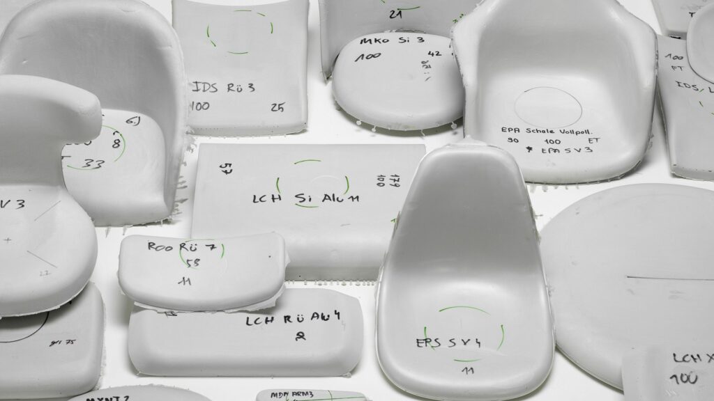 - Integration neuer Werkstoffe wie V-Foam, dem ersten recyclebaren Polyurethan-Schaum von BASF, der derzeit u. a. von Vitra erstmals im Möbelbereich eingesetzt wird (aber weiterhin Erdöl-basiert)